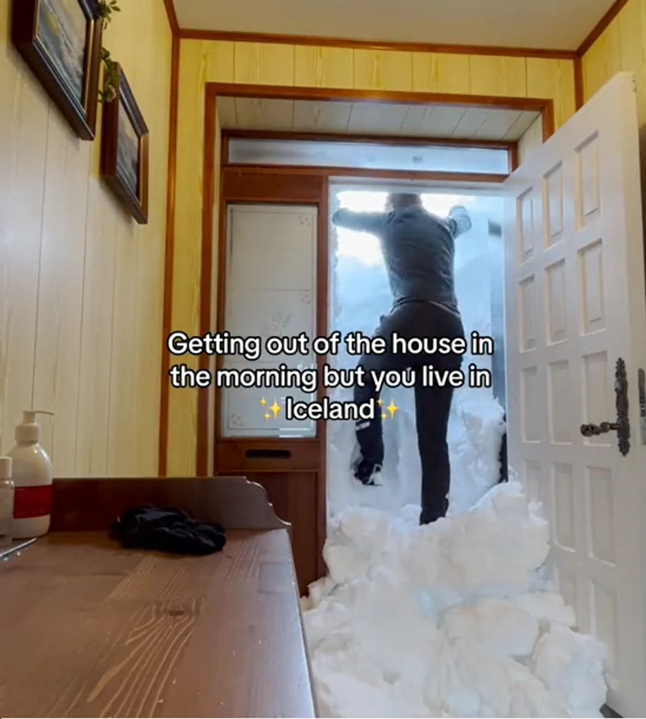 Zbog ogromne količine snega koji zna dostići i više od dva metara visine izlazak iz kuće na Islandu i nije baš najlakša stvar tamošnjih ljudi, što pokazuje i video snimak na Tiktok profilu "66north".