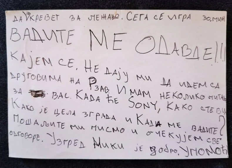 - Dragi mama i tata, ovde je ružno. Deda ne da da sednemo na krevet, pošto kaže da je krevet za ležanje. Sega se igra 30 minuta. Vadite me odavde!!! Kajem se. Ne daju mi da idem sa drugovima na Rzav. Imam nekoliko pitanja za vas. Kada će Soni, kako ste vi, kako je cela zgrada i kada me vadite? Pošaljite mi pismo i očekujem sve odgovore. Uzgred, Miki je dobro. Upomoć - stajalo je u apelu mališana Simića, koji je sudeći po sadržini pisma, u to vreme bio u pravoj "agoniji".