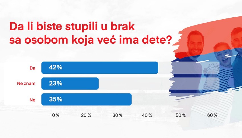 Za 42 odsto ispitanika ulazak u brak s osobom koja ima dete ne bi predstavljala nikakav problem, dok je za 35 odsto ovako nešto neprihvatljivo.