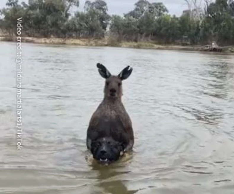 Bivši policajac Mik Malonej iz grada Mildura u Australiji, primetio je da mu nedostaje jedan od pasa, nakon čega je ubrzo ugledao kako kengur u vodi davi njegovog psa. Prilazeći reci, gledao je u kengura koji je u šapama držao psa koji se borio za život.