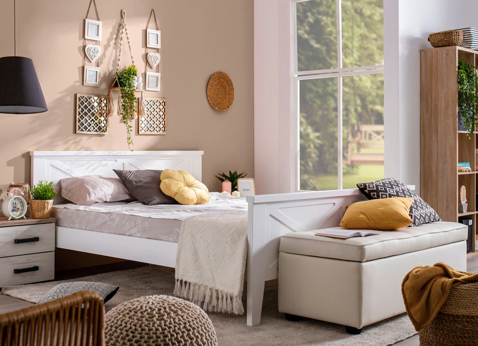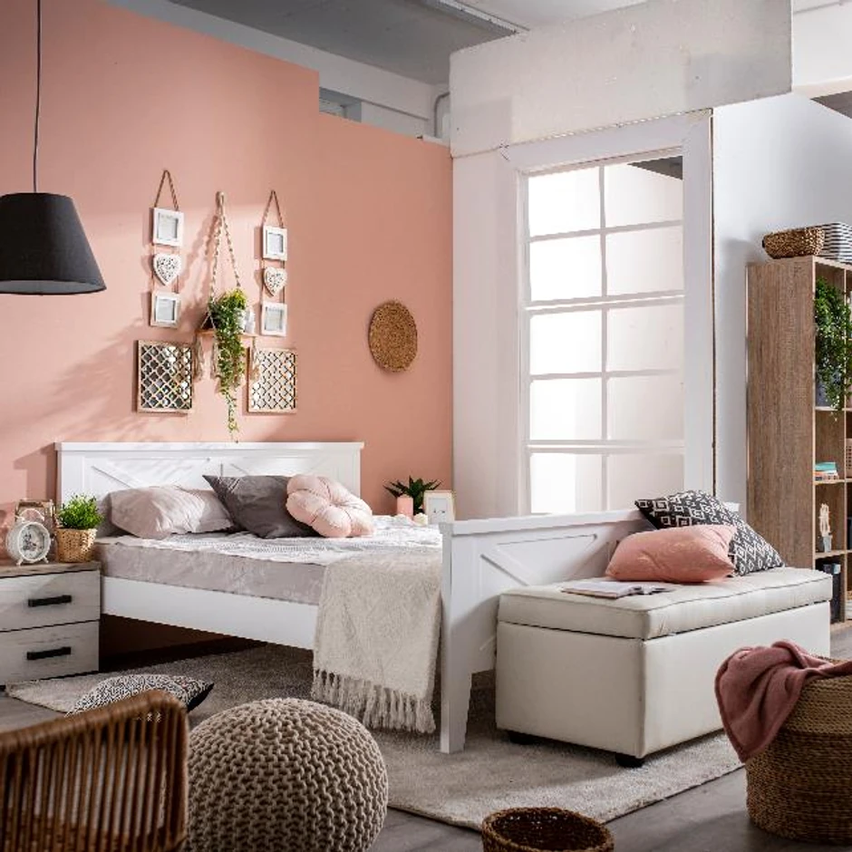 Ukoliko je u pitanju manja soba, u koju u jutarnjim satima ne dopire previše svetla, rešenje je kombinacija svetlih boja zidova i “plutajućeg” minimalističkog nameštaja u belom drvo dekoru, kao što su to krevet AGATA rustičnog šarma i JENNY tabure klupa sa prostorom za odlaganje. Ovakvu sobu možemo dodatno “oživeti” sofisticiranim kreativnim detaljima i poigravanjem paternima i teksturama u vidu posteljine, tepiha i druge dekoracije po našem ukusu.
