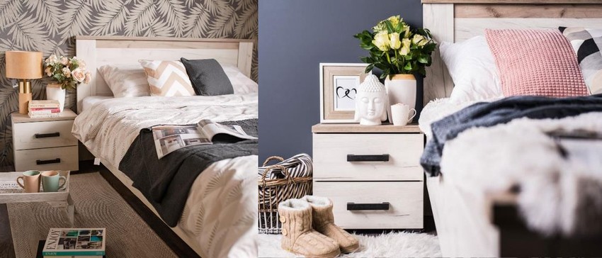 U sobu srednje veličine perfektno će se uklopiti nameštaj neutralnih, prirodnih tonova, poput bračnog kreveta i noćnog ormarića u dezenu belog i sivog hrasta iz Forma Ideale kolekcije KENT. Ovakav ambijent ostavlja vam mogućnost da se igrate svetlima dodavanjem novih lampi ili, recimo, jedan zid da naglasite upečatljivim tapetama ili punijom bojom. Da biste postigli maksimalno upečatljiv utisak, birajte posteljinu jarkih boja ili na zid dodajte neku neobičnu, apstraktnu sliku.
