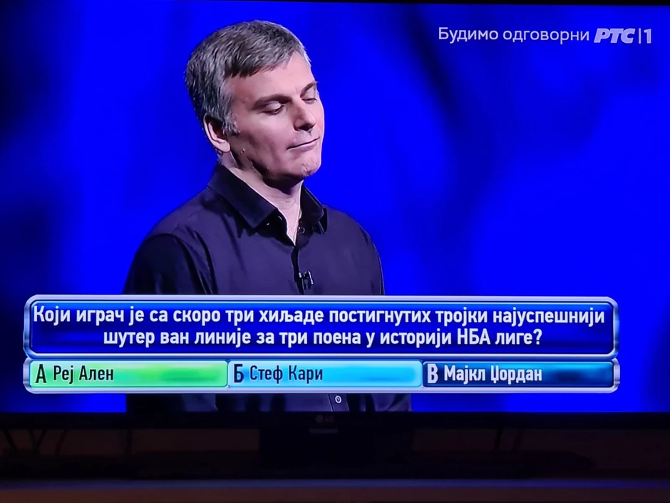 "Koji igrač je sa skoro tri hiljade postignutih trojki najuspešniji šuter van linije za tri poena u istoriji NBA lige?", glasilo je pitanje, dok su ponuđeni odgovori glasili - Rej Alen, Stef Kari, Majkl Džordan.