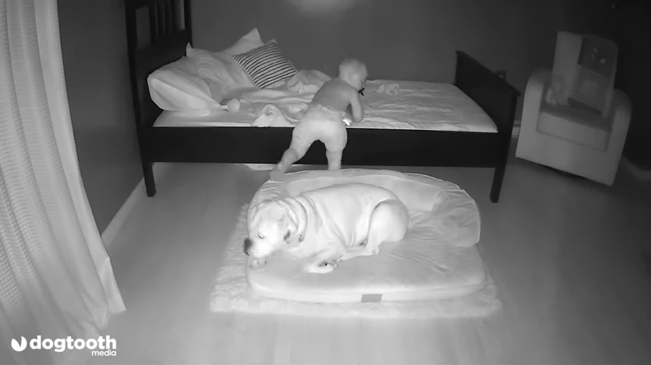 Sve je snimila kamera za bebe koju su roditelji postavili u sobu kada su jedno jutro pronašli ovaj dvojac u psećem krevetiću. Fin se tako probudi tokom noći, uzme svoju dekicu, izađe iz kreveta i pridruži se Brutusu u njegovom – na podu. Pas mu posluži kao jastuk, pa se tako osloni na njega i udobno smesti.