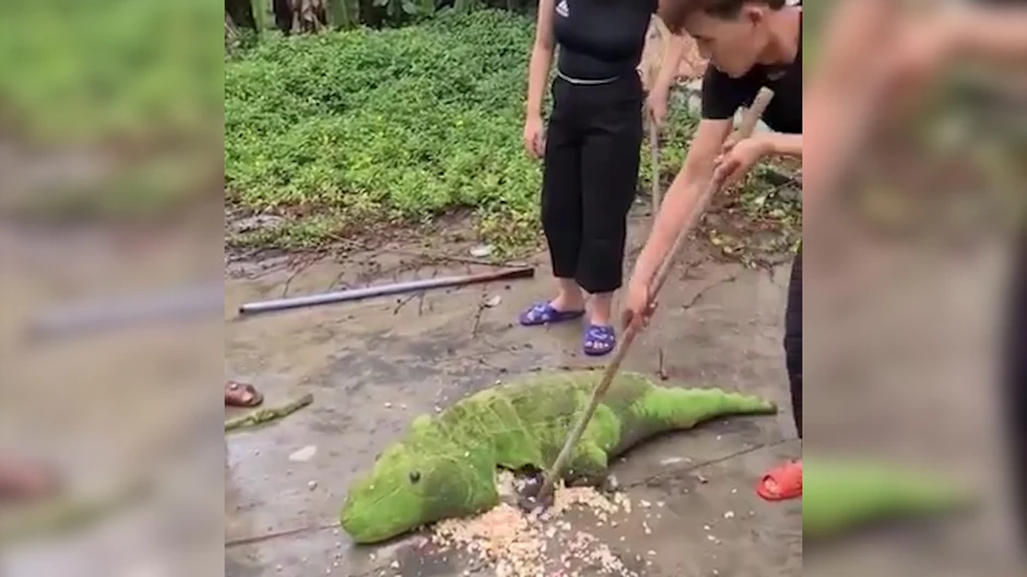 Dve devojke i mladić su primetili da se u velikom plišanom aligatoru nešto pomera, te su odlučili da vide šta se unutra nalazi.