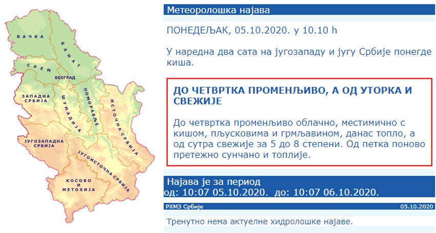Dodao je da će od 15. oktobra do kraja meseca ponovo biti promenljivo sa po nekoliko suvih i vlažnih dana, te da će oktobar, generalno posmatrano, biti topliji u odnosu na prosek za taj mesec, kada je naše podneblje u pitanju.