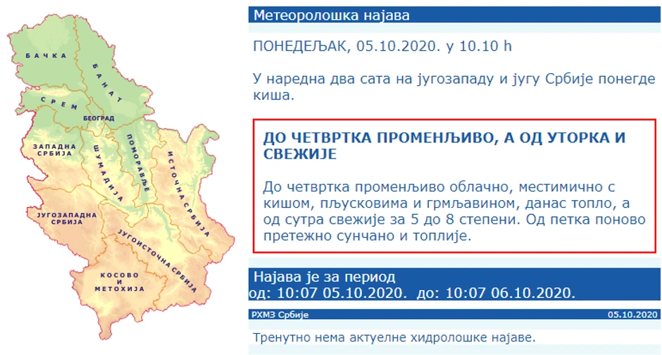Naveo je da se u narednim danima, do četvrtka, očekuje promenljivo vreme sa relativno malim količinama padavina, a da će od petka do 15. oktobra biti suvo i sunčano vreme, sa odlikama Miholjskog leta.
