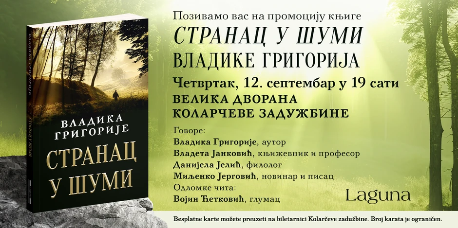 Nova knjiga vladike Grigorija „Stranac u šumi“ dostupna je i na ćirilici i na latinici u svim knjižarama Delfi i Laguninim klubovima čitalaca, na sajtovima laguna.rs i delfi.rs, kao i na kioscima širom Srbije.