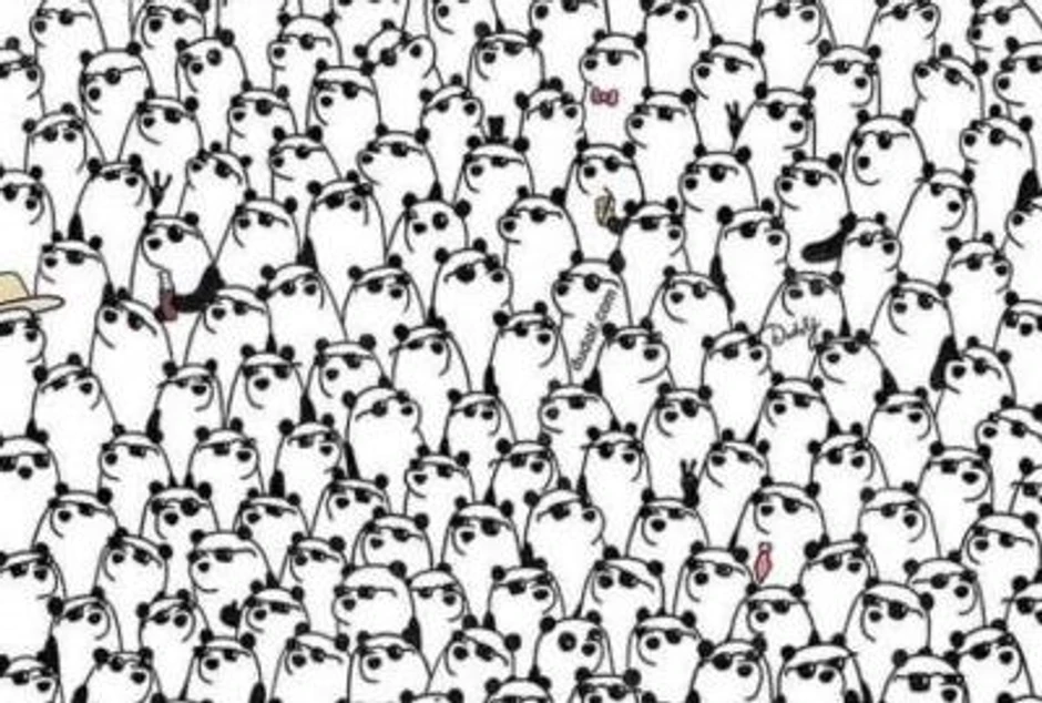 Na ilustraciji se nalazi veliki broj pandi, od kojih su gotovo sve u istom stilu: nose naočare, neke drže limenku u šapi, druge imaju leptir-mašnu ili šešir. Upravo zbog mnoštva detalja mozak se lako zbuni, pa potraga za tri padne bez naočara postaje iznenađujuće teška.