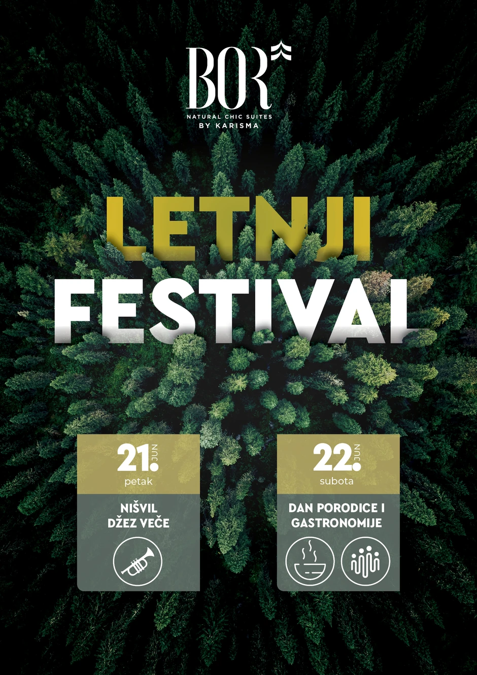 Najnoviji hotel u Srbiji sa pet zvezdica, BOR Hotel by Karisma, u saradnji sa Turističkom organizacijom Zlatibor, ovog juna organizuje prvi BOR letnji festival. Reč je o dvodnevnoj manifestaciji muzike, gastronomije i porodične zabave koja će da se održi u prelepom ambijentu BOR Hotela by Karisma, 21. i 22. juna 2024. godine na Zlatiboru. Ulaz je besplatan i otvoren za sve posetioce koji će imati jedinstvenu priliku da uživaju u bogatom programu na početku letnje sezone na najlepšoj planini u Srbiji.