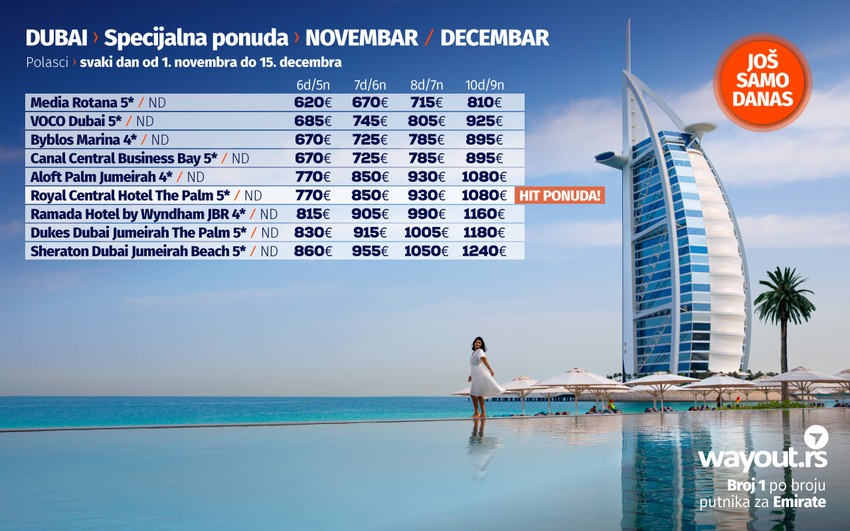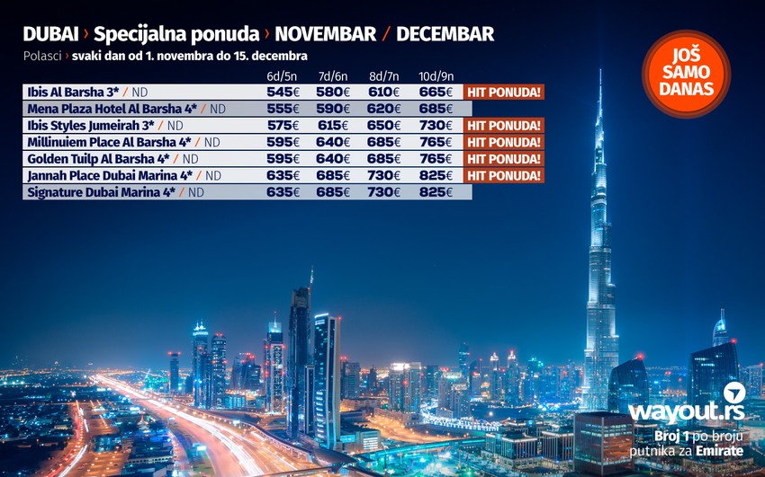 Uz veliku zahvalnost na dugogodišnjoj saradnji avio kompaniji Fly Dubai koja obavlja direktne letove za Dubai svakog dana u nedelji, kao što ste navikli prethodne jeseni i zime, uz neizbežan odmor na divnim plažama Arabijskog zaliva, preporučujemo putovanje u Dubai u oktobru, novembru i decembru. Za naše putnike smo izdvojili neke od najpopularnijih hotela sa najpristupačnijim cenama, a Dubai svakako važi za jednu od najsigurnijih i najorganizovanijih destinacija koje su se među prvima oporavile i nastavile normalno funkcionisanje nakon pandemije, a ako ste navikli da svoje putovanje u Dubai rezervišete preko turističkih portala, proverite naše paket aranžmane koji uključuju avio karte, transfere na destinaciji, smeštaj u vrhunskim hotelima, kao i usluge licenciranog vodiča na srpskom jeziku i uverite se u to da su naše cene najpovoljnije uz maksimalno kvalitetnu uslugu.