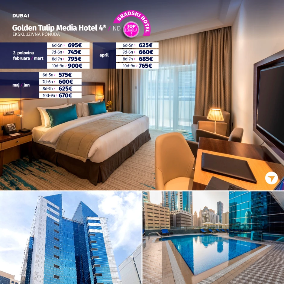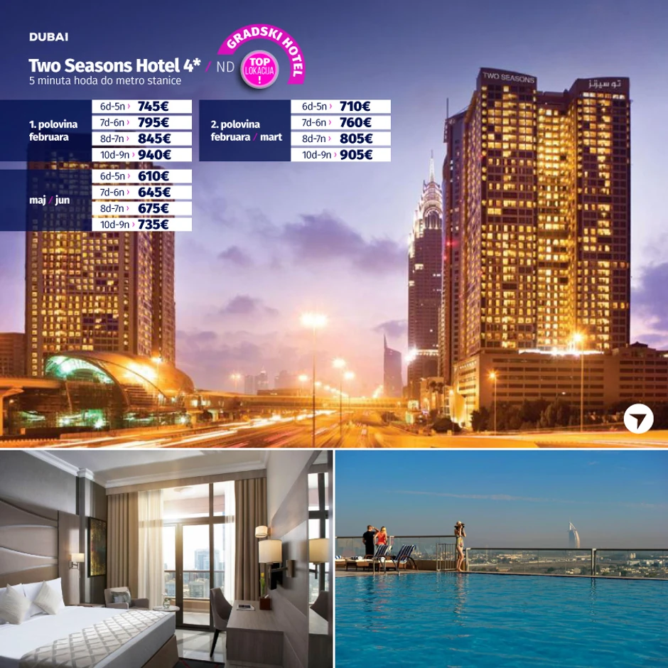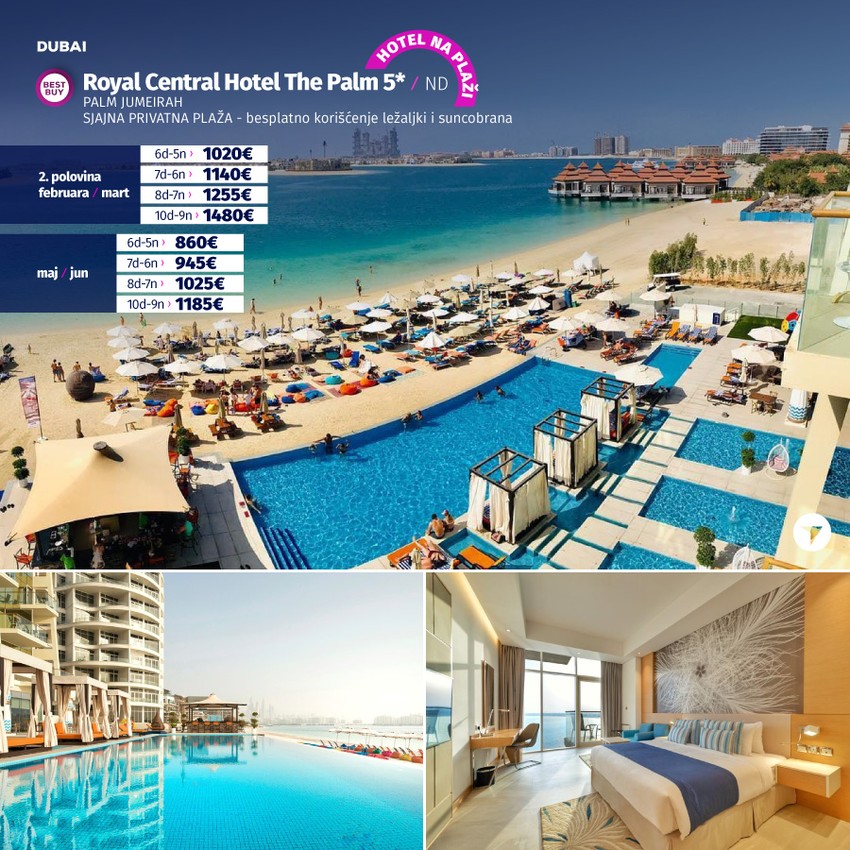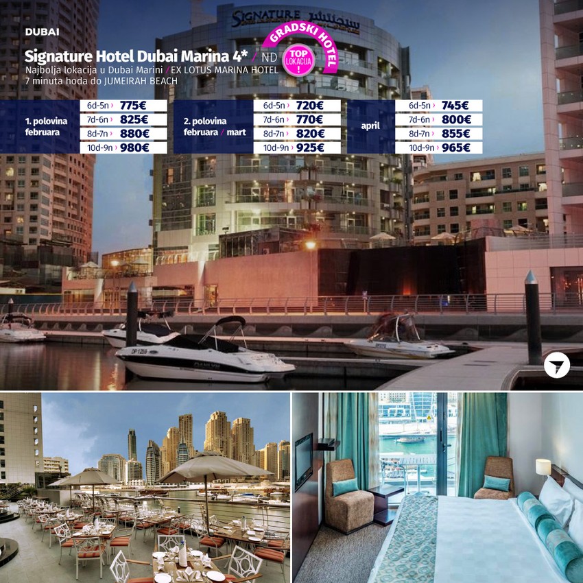 Iz ponude bismo posebno izdvojili hotele u Dubai Marini koji su omiljeni među našim putnicima, Byblos Marina 4*, kao i jedan od najbolje pozicioniranih hotela u Dubaiju, zatim moderni hotel Rove Dubai Marina koji ima odlične recenzije svojih gostiju, posebno mlađe populacije. Ovi hoteli su idealno pozicionirani za ljubitelje city-break-a koji žele da im i plaža bude nadohvat ruke. Kao hotele za odmor na prelepim plažama, izdvojili bi smo novootvoreni Radisson Beach Resort Palm Jumeirah koji ima promotivnu cenu povodom otvaranja, kao i Royal Central Hotel The Palm 5* koji svojim gostima nude besplatno korišćenje ležaljki i suncobrana. Za one koji žele da otputuju u Dubai zbog šopinga i razgledanja grada, izdvojili bismo hotele koji se nalaze na svega nekoliko minuta udaljenosti od najpoznatijih svetskih tržnih centara, Two Seasons Hotel 4*, Signature 1 Hotel Tecom, Signature Hotel Al Barsha u blizini Mall of The Emirates, kao i Ibis One Central i Novotel World Trade Centre u blizini najvećeg tržnog centra na svetu Dubai Mall i najviše zgrade na svetu Burj Khalifa-e.
