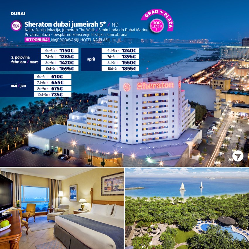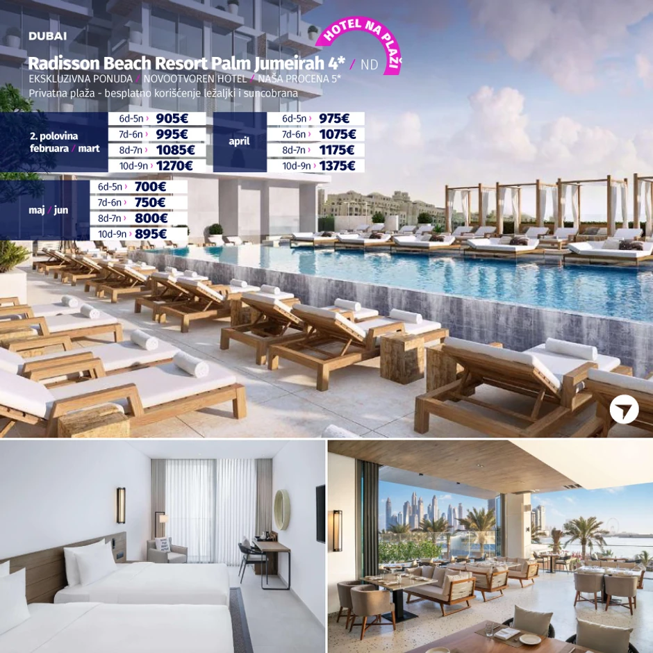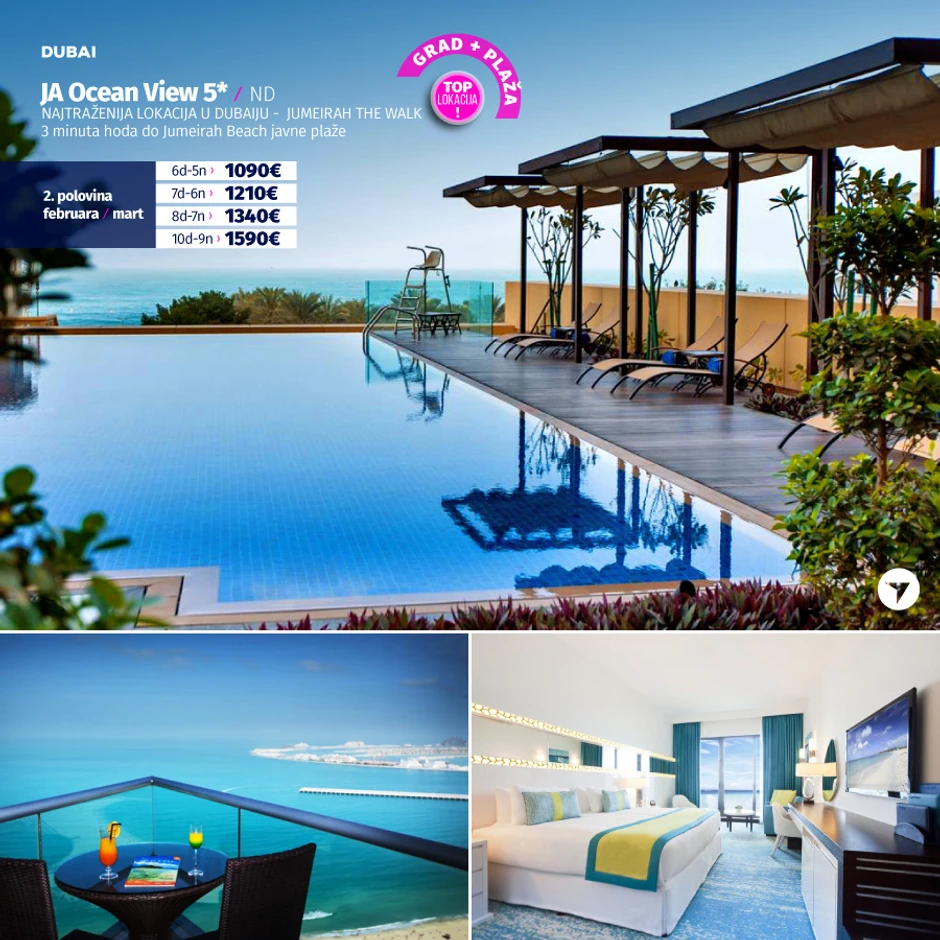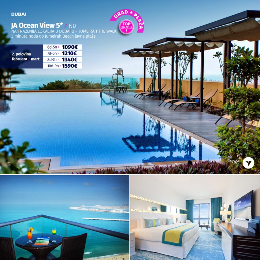 Iz ponude bismo posebno izdvojili hotele u Dubai Marini koji su omiljeni među našim putnicima, Byblos Marina 4*, kao i jedan od najbolje pozicioniranih hotela u Dubaiju, zatim moderni hotel Rove Dubai Marina koji ima odlične recenzije svojih gostiju, posebno mlađe populacije. Ovi hoteli su idealno pozicionirani za ljubitelje city-break-a koji žele da im i plaža bude nadohvat ruke. Kao hotele za odmor na prelepim plažama, izdvojili bi smo novootvoreni Radisson Beach Resort Palm Jumeirah koji ima promotivnu cenu povodom otvaranja, kao i Royal Central Hotel The Palm 5* koji svojim gostima nude besplatno korišćenje ležaljki i suncobrana. Za one koji žele da otputuju u Dubai zbog šopinga i razgledanja grada, izdvojili bismo hotele koji se nalaze na svega nekoliko minuta udaljenosti od najpoznatijih svetskih tržnih centara, Two Seasons Hotel 4*, Signature 1 Hotel Tecom, Signature Hotel Al Barsha u blizini Mall of The Emirates, kao i Ibis One Central i Novotel World Trade Centre u blizini najvećeg tržnog centra na svetu Dubai Mall i najviše zgrade na svetu Burj Khalifa-e.