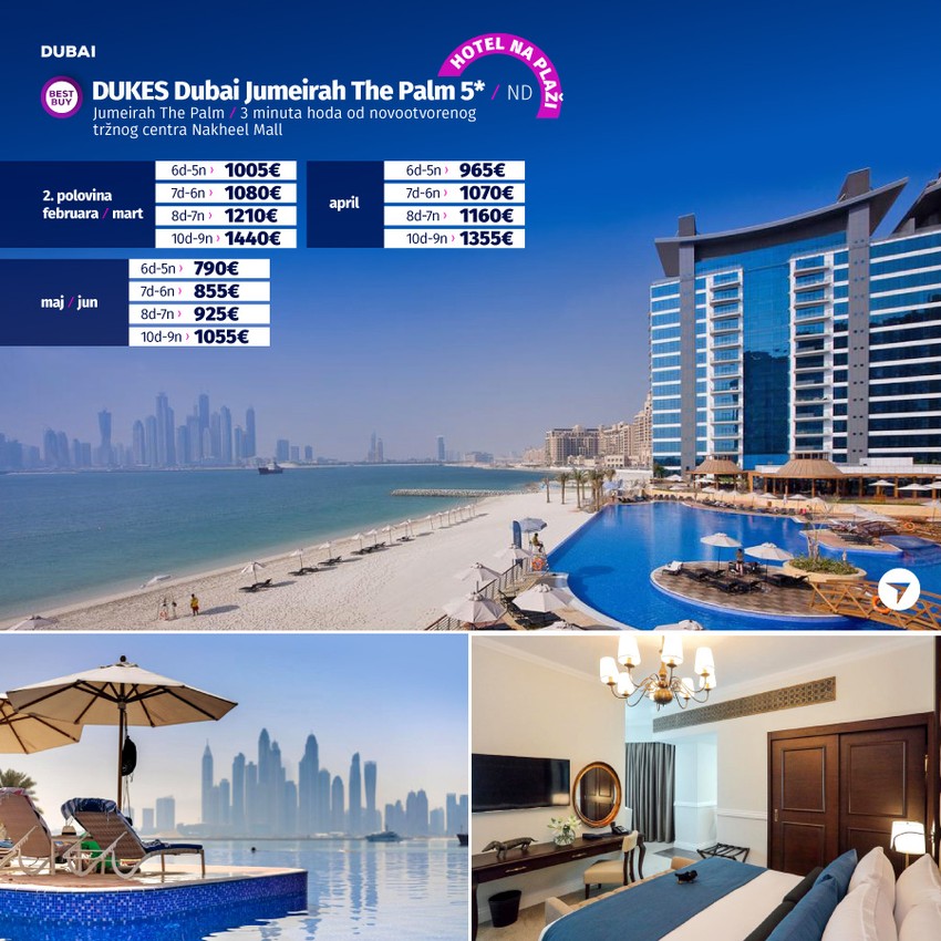 Hotel DUKES DUBAI smešten je na Palm Džumeiri. Hotel odlikuje spoj britanskog šarma i komsopolitskog luksuza. Gosti mogu da se opuste u bazenu (lenja reka), kao i da se bave raznim sportovima na vodi. Hotel poseduje 279 luksuzno uređenih soba i 227 elegantno opremljenih apartmana s hotelskom uslugom i izvanrednim pogledom na Persijski zaliv i panoramu Dubai Marine. Smeštajne jedinice sadrže flat-screen TV sa satelitskim kanalima, pribor za pripremu kafe i čaja, veliki ormar i sef. Dodatne pogodnosti uključuju bade-mantile, papuče i besplatan toaletni pribor Floris. U hotelu se služe najbolja jela britanske kuhinje. U restoranu Great British (GBR) služi se izbor britanskih jela tokom celog dana. Iz restorana se pruža lep pogled na panoramu Dubai Marine. Gosti takođe mogu da obeduju u baru i restoranu West 14th koji se nalazi na plaži. U baru DUKES služe se neki od najboljih svetskih martinija. Na 14. spratu nalazi se vrhunski opremljena teretana sa modernom opremom i prozorima od poda do plafona sa odličnim pogledom na panoramu Dubai Marine. Ostali sadržaji uključuju veoma popularan frizerski salon. Na samo 30 minuta vožnje nalaze se Aerodrom Dubai (DXB) i Međunarodni aerodrom Al Maktum. Tržni centar Mol of Emirejts nalazi se na 20 minuta vožnje, a Dubai Mol na 30 minuta. Svi zabavni parkovi i odmarališta u Dubaiju su takođe udaljena 30 minuta od smeštajnog objekta.