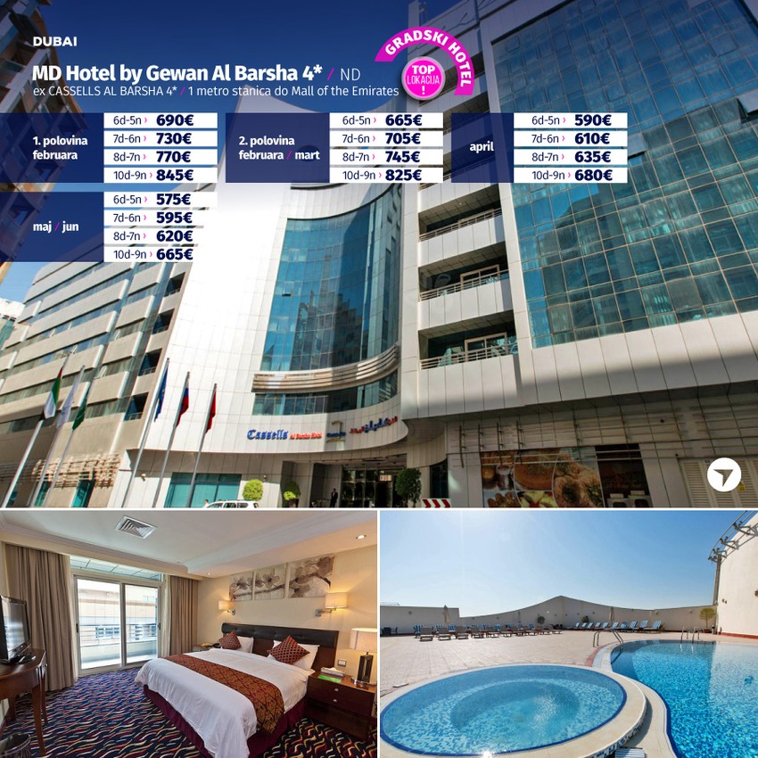 Hotel se nalazi u novom delu Dubaija u oblasti Al Barsha i na 5 min pesaka od Metro stanice DUBAI INTERNET CITY.Trzni centar Mall of The Emirates i Dubai Marina se nalaze na 5 min voznje. Hotel ima bazen na krovu hotela. Raspolaze sa 2 restorana, jedan na prvom spratu u kojem se posluzuju dorucak, rucak I vecera, a drugi je a la carte koji se nalazi pored recepcije. Od dodatnih sadrzaja u hotelu se nalazi salon lepote, supermarket koji radi 24 sata BLU MART. Preko puta hotela nalazi se banka.