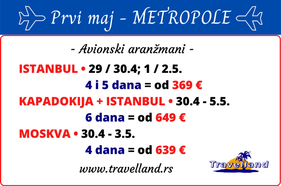 “U aprilu putujemo na sve strane, koliko nam bar to okolnosti dozvoljavaju. Za praznike ćemo sigurno biti u Istanbulu, Kapadokiji, Moskvi, Dubaiju, ali i na Crvenom moru, Kipru, Crnoj Gori. Mesta na avionima se popunjavaju, i ne treba čekati baš poslednji trenutak” – poručuju iz agencije “Travelland”.