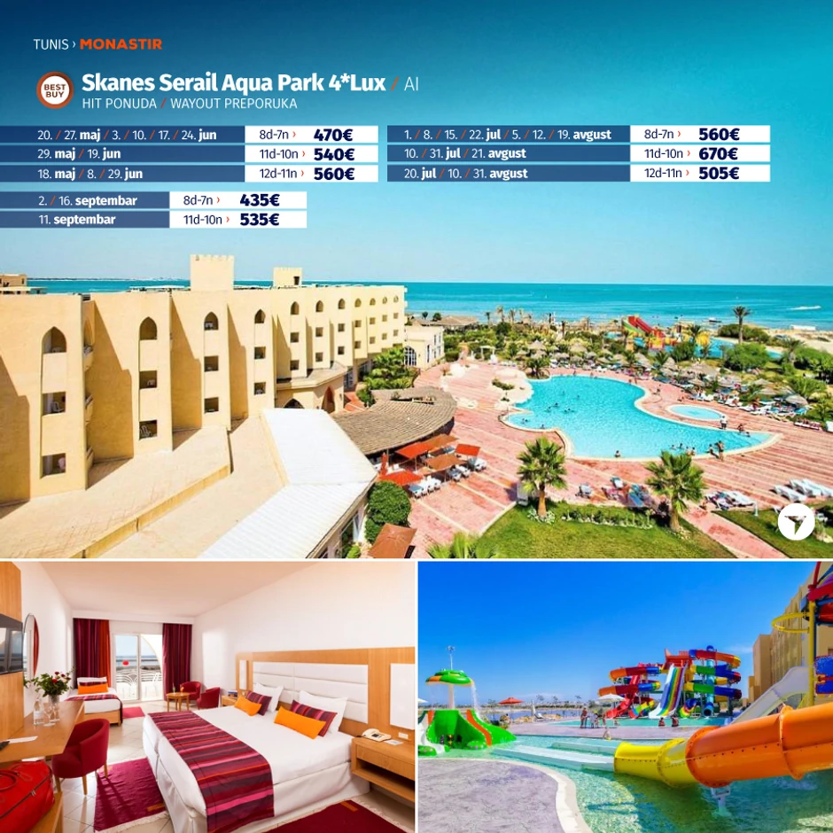 Monastir je grad udaljen 160km od grada Tunisa, sa internacionalnim aerodromom. Karakteristično za ovaj grad su duge peščane plaže, a grad obiluje velikim brojem istorijskih lokaliteta. U Monastiru možete da izaberete hotele Skanes Serail 4* Lux, Delphine El Habibe 4*Lux, Royal Jinene 4*