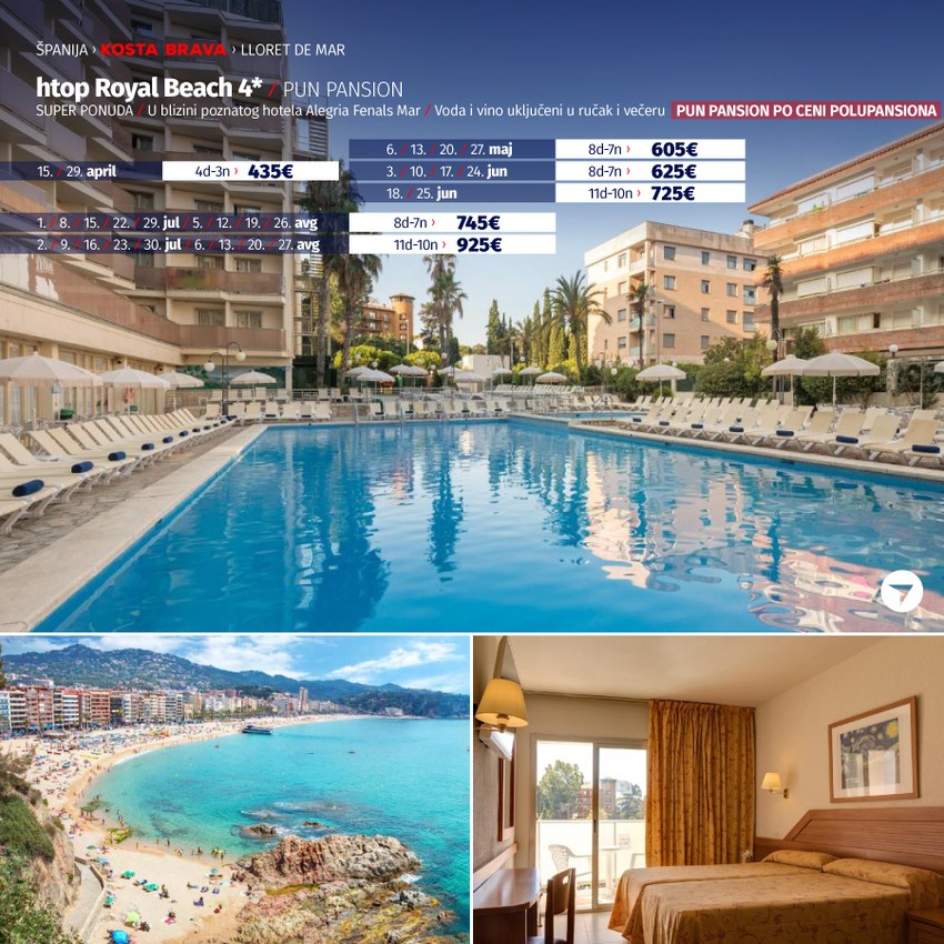 Ovaj objekat je udaljen 3 min hoda od plaže. Royal Beach poseduje otvoreni bazen i krovnu terasu sa hidromasažnom kadom. Smešten je na 50 metara od plaže Fenals u Ljoret de Maru i nudi sobe sa balkonima. Sve sobe u objektu Royal Beach su klimatizovane i nude svetao i jednostavan dekor. Svaka soba sadrži TV sa satelitskim kanalima i sef. Objekat Royal Beach je smešten u atraktivnim vrtovima i ima dečiju zonu za igranje. Restoran služi izbor jela internacionalne kuhinje na bazi švedskog stola, a tu i je bar sa noćnim zabavnim programom. Centar Ljoret de Mara se nalazi na samo 10 minuta hoda. Teren za golf PGA Catalunya i Water World Park su na samo 3 km od hotela Royal Beach.