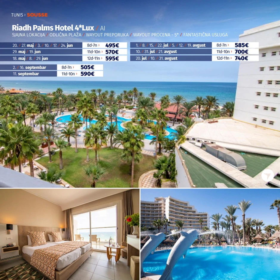 Sousse je važan tunižanski turistički centar i jedan od najvećih gradova ove države. Grad je poznat po brojnim barovima i lokalima gde je provod zagarantovan. Hoteli koje vam preporučujemo su: Movenpick Marine 5*, Riadh Palms 4*, Marhaba Club 4*.