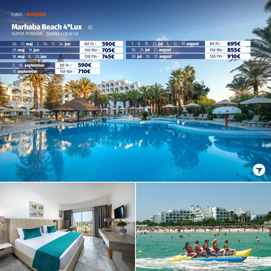 Hammamet i Yasmine Hammamet je grad koji gosti rado biraju. Pogodan je za sportove na vodi, a ovo mesto kao i sve ostale turističke centre krase prelepe plaže. Grad je smešten na jugo-istoku i pripada regiji Nabeul. Od grada Tunis udaljen je 65km. Neki od hotela iz naše ponude u ovom gradu su: Mehari Hammamet Thalasa &SPA 5* koji odiše luksuzom i modernim dizajnom, Steigenberger Marhaba Thalasso Hammamet 5* - hotel iz poznatog lanca hotela čiji je kvalitet već poznat kod srpskih turista,Iberostar Averreos 4* i mnogi drugi.