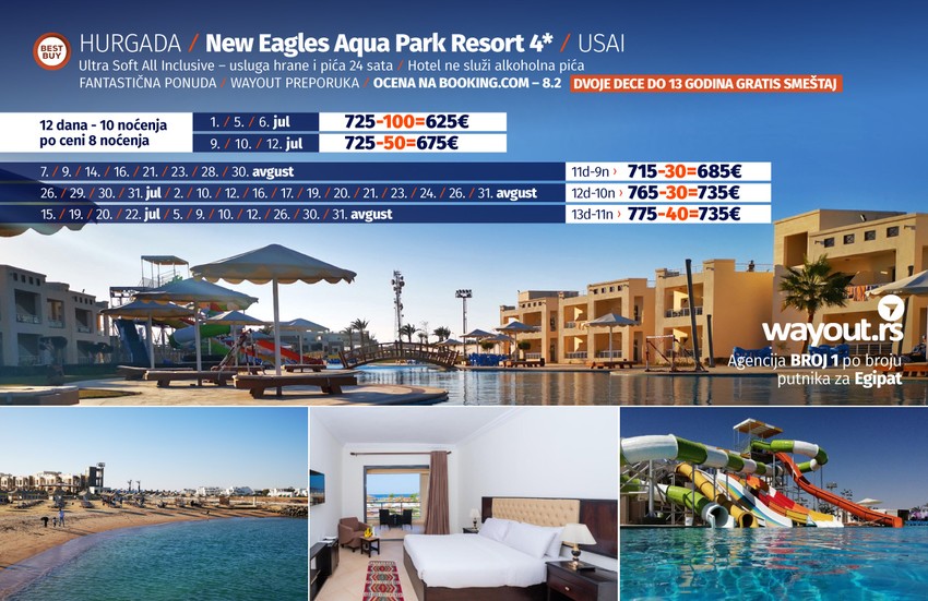 Naravno, period u julu i avgustu je najfrekventniji kada su u pitanju godišnji odmori, a za sve naše putnike, u saradnji sa najpopularnijim hotelima na našem tržištu, a definitivno je Hurgada porodično letovalište i kada se ceo trošak sabere, uzimajući u obzir nadaleko poznati All Inclusive koncept, ova destinacija je najisplativija, a Wayout agencija je ekskluzivno za svoje putnike obezbedila gratis smeštaj za dvoje dece do 14 godina u hotelima New Eagles Aqua Park, Long Beach Resort, Bella Vista, La Rosa Waves i Tia Makadi Heights.
