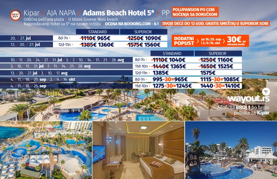 Sa širokim spektrom aktivnosti i sadržaja, luksuzni hotel Adams Beach nudi sve usluge koje je hotel sa 5 zvezdica potrebno da ima uz opuštajuću atmosferu, sa ciljem da se osećate kao kod kuće dok ste na odmoru. Osim toga, hotel ima fantastičnu lokaciju na zlatnom pesku zaliva Nissi plaže, jedne od najpoznatijih na Kipru. Za one koji žele da istraže sjajna svetla Aja Nape, centar ovog prelepog mesta udaljen je svega 3 km, samim tim se možete kratkom vožnjom taksijem odvesti do tamo. Uživajte u bazenu velike površine i zabavite se sa svojom porodicom! Za sunčanje idite na terasu sa ležaljkama i suncobranima koje predstavlja pravo mesto za odmor i opustanje. Bez obzira da li želite obrok, laganu užinu ili samo piće, hotel Adams Beach ima sve to na raspolaganju. Izaberite glavni restoran, a la carte restoran na krovu, bar pored bazena, bar na plaži, suši bar, sportski pab sa satelitskom televizijom... lista se može nastaviti. Sa savršenom kombinacijom zabave i uživanja, hotel Adams Beach je veoma omiljen među putnicima, parovima, porodicama i grupama prijatelja. Hotelski smeštaj je moderan i veoma udoban (svaka soba je opremljena klima uređajem, mini barom, telefonom i sopstvenim kupatilom sa kadom i fenom za kosu), a širok spektar sadržaja znači da nećete morati da napuštate hotel u potrazi za zabavom. Deca će takođe voleti da se provedu ovde jer postoji dečiji bazen, živahan animacijski program i dečiji klub za najmlađe.