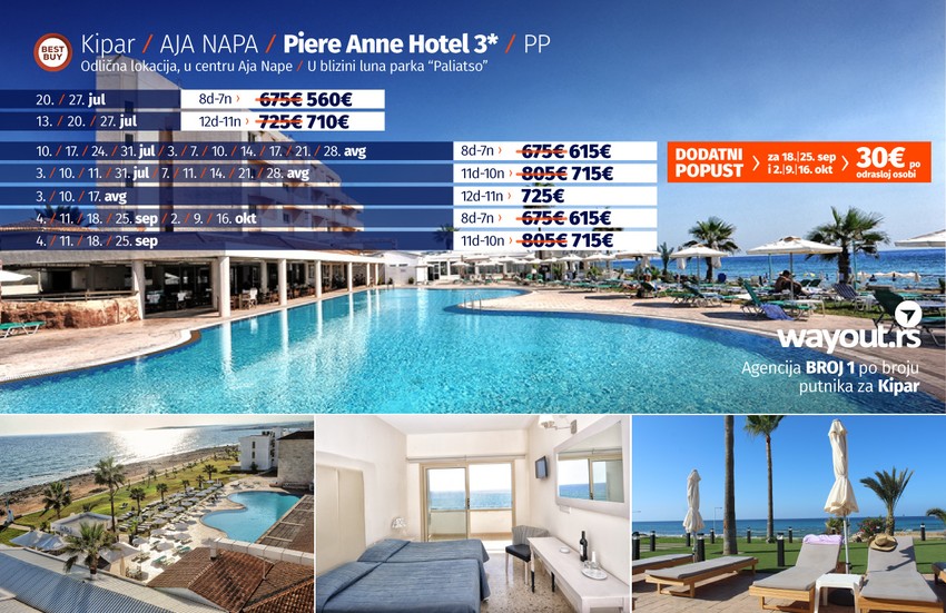 Hotel Piere Anne ima odličnu lokaciju na obali mora, na 5 minuta od centra Aja Nape i na 5 minuta od luke i plaže. Zabavni park Parko Paliatso Fun se takođe nalazi odmah iza hotela, zajedno sa čuvenom ulicom Nissi Avenue. U neposrednoj blizini nalaze se prodavnice, barovi i restorani, a svi sadržaji Aja Nape su na dohvat ruke. Hotel Piere Anne se sastoji od 3 bloka soba sa 2 velika otvorena bazena.Bazeni imaju direktan pristup stazi uz more, a bar pored bazena "En Plo" je odlično mesto za opuštanje tokom dana. Iako hotel nema mnogo sadržaja na licu mesta, Piere Anne je toliko blizu svega u Aja Napi da je odlična baza za zabavu na plaži ili provod u klubovima., kao i odmor uz Mediteran.