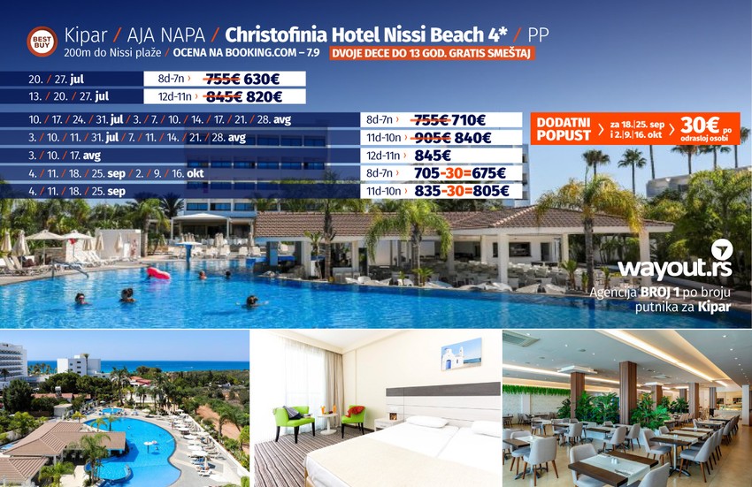 Hotel Christofinia se nalazi u najpopularnijem, kosmopolitskom letovalištu Aja Napa i na svega nekoliko minuta hoda od čuvene plaže Nissi Beach. Hotel je veoma miran i okružen je prelepim, prostranim vrtovima i vrhunskim bazenom. Porodice i parovi mogu da se rashlade u ogromnom bazenu u obliku lagune, u kom se nalazi odlično opremljeni bar. Gostima hotela na raspolaganju je i dečiji bazen. Plaža Nissi Beach je jedna od najpoznatijih plaža na Kipru koja je nagrađena Plavom zastavom i nalazi se odmah iza ugla. Udaljen je 3 kilometra od užurbanog centra letovališta i na 200 metara od ulice pune barova, restorana i prodavnica. Sve navedeno se nalazi na pešačkoj udaljenosti od hotela. Christofinia je idealan izbor za savršen i nezaboravan odmor u tihom i mirnom kraju Aja Nape.
