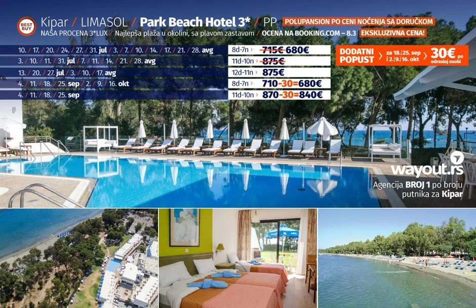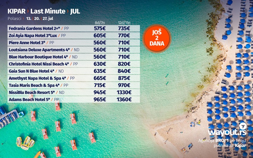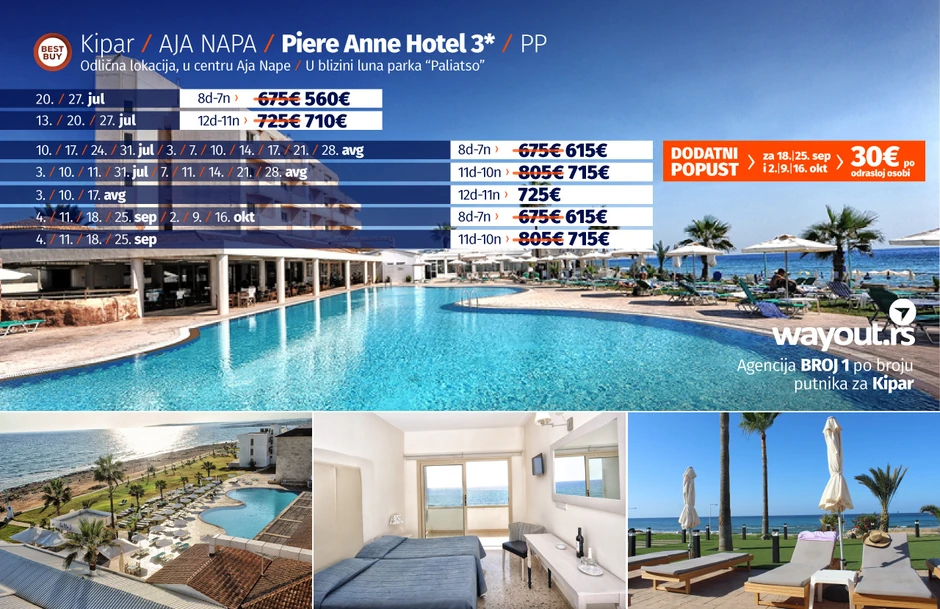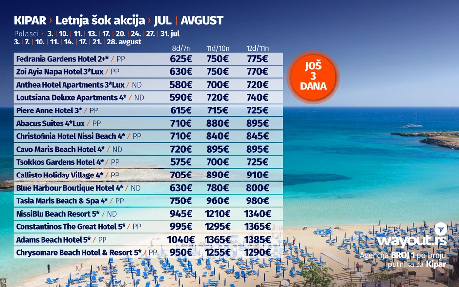 Definitivno jedna od novih omiljenih letnjih destinacija naših turista jeste Kipar. Sunčano i toplo vreme, prelepe plaže, fantastično more, odlična usluga i kvalitetni hoteli, u kombinaciji sa nikad povoljnijim aranžmanima za najtraženiji period putovanja u junu, julu i avgustu, navelo je putnike da se odluče za putovanje na ovo prelepo ostrvo. A ako ste navikli da svoje putovanje na Kipar koristite turističke online portale, nemojte da vam bude teško da proverite Wayout cene aranžmana, uverićete se da ne postoji povoljnija, a kvalitetnija ponuda na tržištu, a ukoliko nađete jeftiniji aranžman nego u našoj agenciji, vratićemo razliku.