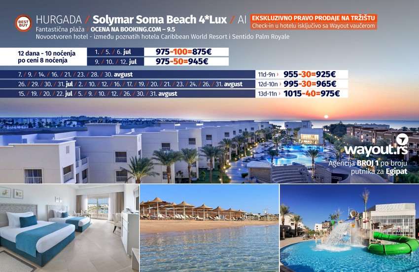 Ako su vam hoteli sa 5* preskupi, preporučujemo vam hotel Solymar Soma Beach, sa ocenom 9.5 na Booking.com, koji je jedan od najkvalitetnijih hotela u Hurgadi, a koji se nalazi na istoj plaži, a između poznatih hotela Carribbean World Resort i Sentido Palm Royale.