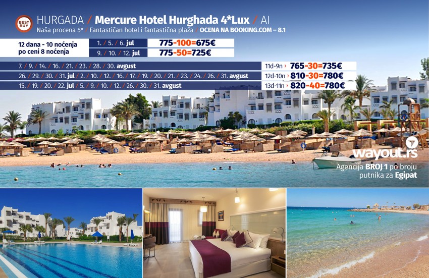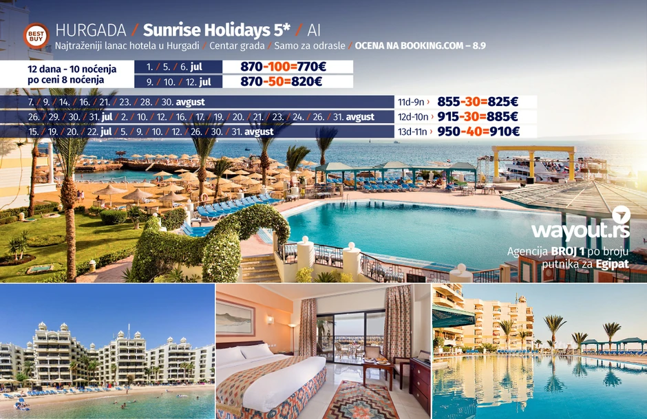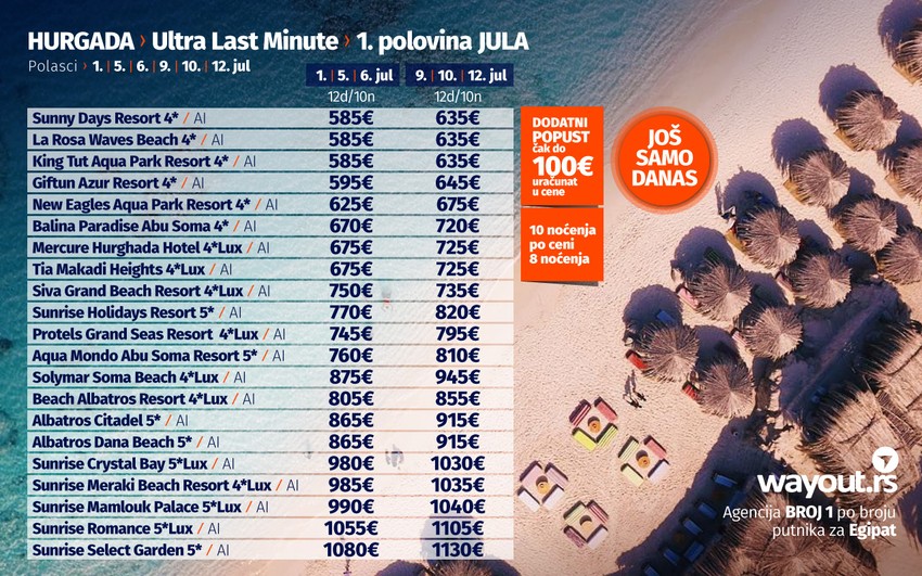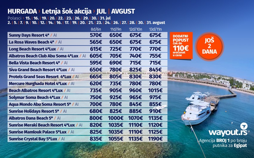 Kada je problem testova i uslova za ulazak u Egipat rešen, vreme je da bez stresa odaberete hotel po vašem ukusu i prepustite se planiranju svog dugo čekanog odmora. Za sve putnike koji žele da u julu provedu svoj odmor u Hurgadi, pripremili smo fantastičnu Last Minute akciju za polaske u prvoj polovini jula, kao i Letnju šok akciju za sve polaske u drugoj polovini jula i avgustu. Naravno, kao što ste navikli od Wayout agencije, u ponudi se nalazi najveći izbor hotela za svačiji ukus i svačiji džep i uključuje veliki broj najpopularnijih i najkvalitetnijih hotela u Hurgadi. Naravno, sve to u kombinaciji sa najpovoljnijim cenama na tržištu, Wayout ponudu za Hurgadu čini najboljom na tržištu što potvrđuje zvanje turoperatora br. 1 po broju putnika za Hurgadu.
