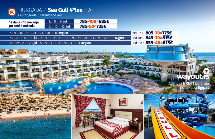 Takodje bismo posebno izdvojili tek renovirani i rebrendirani hotel za koji Wayout agencija ima ekskluzivno pravo prodaje za ceo region Protels Grand Seas Resort sa jednom od najlepših i najdužih plaža u Hurgadi, kao i neke od najpopularnijih hotela na našem tržištu kao što Sea Gull, ili neki od čuvenih hotela iz Sunrise lanca hotela kao što su Sunrise Aqua Joy koji je prilagođen porodicama sa decom na samom šetalištu Memša, a na kraju bismo izdvojili i jedan od najboljih hotela u Hurgadi sa po mnogim mišljenjima najlepšom plažom u Hurgadi - Sunrise Romance. Hurgada i Egipat nisu samo letovanje i kupanje u moru, već i fantastična all inclusive usluga, bogat noćni život, sunčanje tokom celog odmora, sjajni hotelski aqua parkovi za decu i bazeni koji se greju u toku zimskih meseci, odlasci na nezaboravne izlete u Luksor, Kairo, pustinjski Safari i još mnogo, mnogo toga.