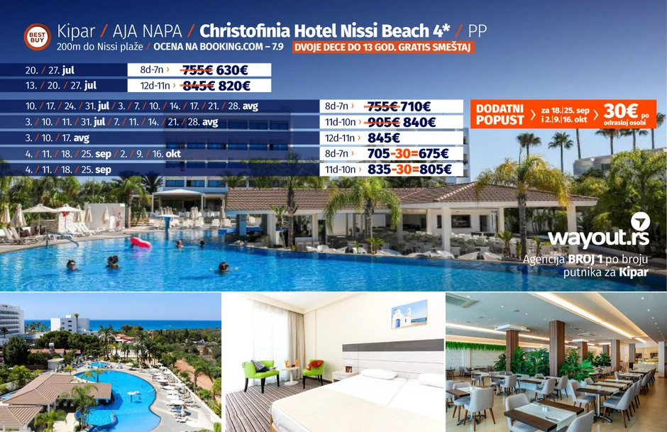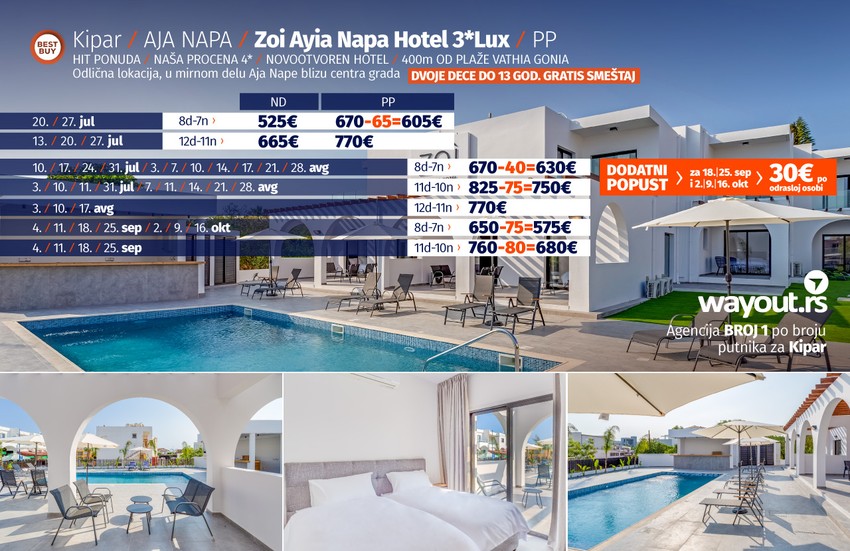 Ne propustite Letnju Šok akciju za jul i avgust, kao i za septembar i oktobar, koja se sastoji se od mešavine najtraženijih, najkvalitetnijih i najbolje ocenjenih hotela na Kipru, a sve to uz spektakularno povoljne cene, slobodno možemo reći i najpovoljnije do sad. Od hotela za ovaj period bismo izdvojili hotele u Aja Napi koji se nalaze na odličnim lokacijama blizu plaža i samog šetališta, a to su Pierre Anne Hotel i Tasia Maris Beach koji se nalazi uz obalu, i Fedrania Gardens, a svega nekoliko minuta hoda od samog centra Aja Nape, kao i Abacus Suites, luksuzni boutique hotel takođe nedaleko od plaže i centra svih zbivanja u Aja Napi. Svakako, ne smemo zaboraviti porodični hotel Callisto Holiday Village sa promocijom koja podrazumeva da dvoje dece do 14 godina ne plaćaju smeštaj kao i jedan od najluksuznijih hotela u Aja Napi Adams Beach, koji u Superior sobi može smestiti dvoje dece do 13 godina koja plaćaju samo avio kartu, kao i hotel Christofinia Hotel koji se nalazi svega 200 metara udaljen od Nissi plaže.
