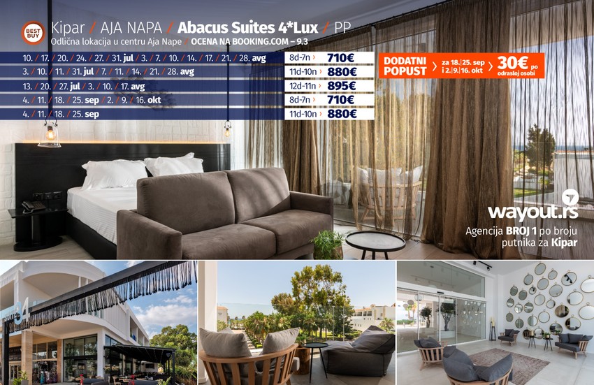 Abacus Suites, nalazi se na idealnoj lokaciji u letovalištu Aja Napa, samo nekoliko minuta udaljen od centra grada, u blizini svih glavnih sadržaja kao što su prodavnice, restorani i plaže. Hotel je otvoren 2018. godine i sadrži 36 raskošno dizajniranih apartmana, koji su