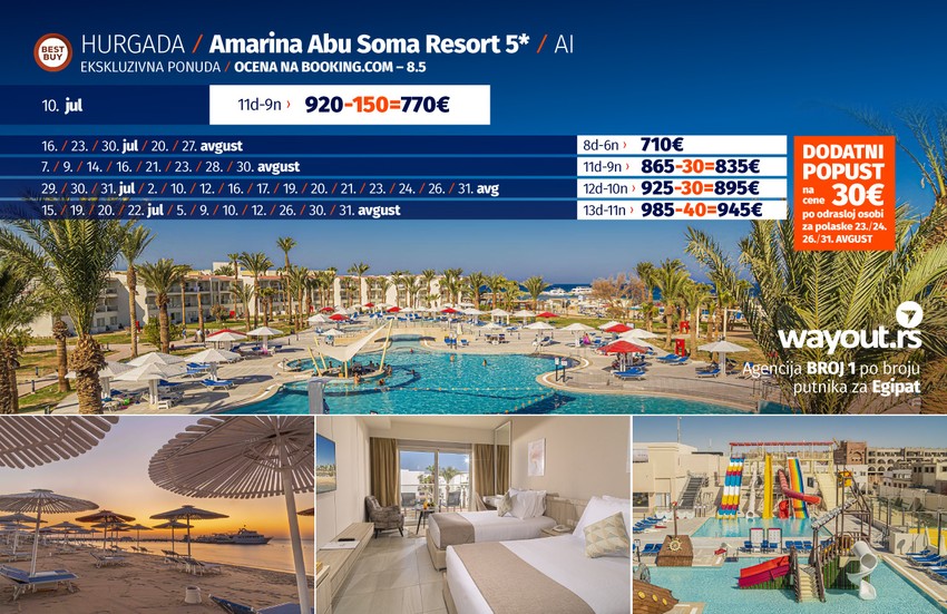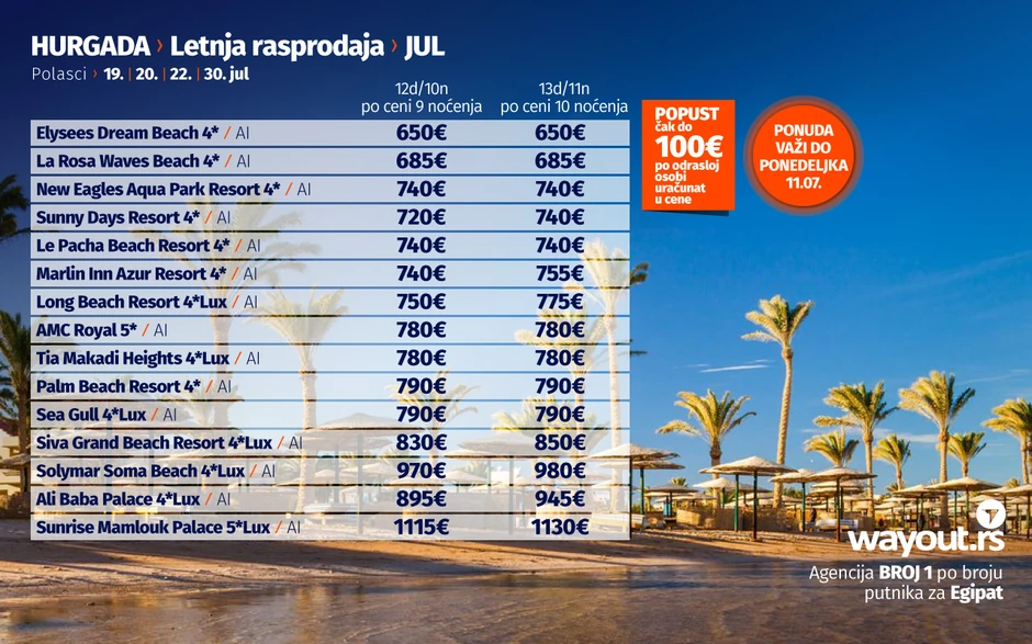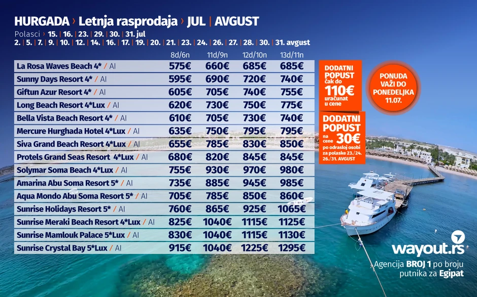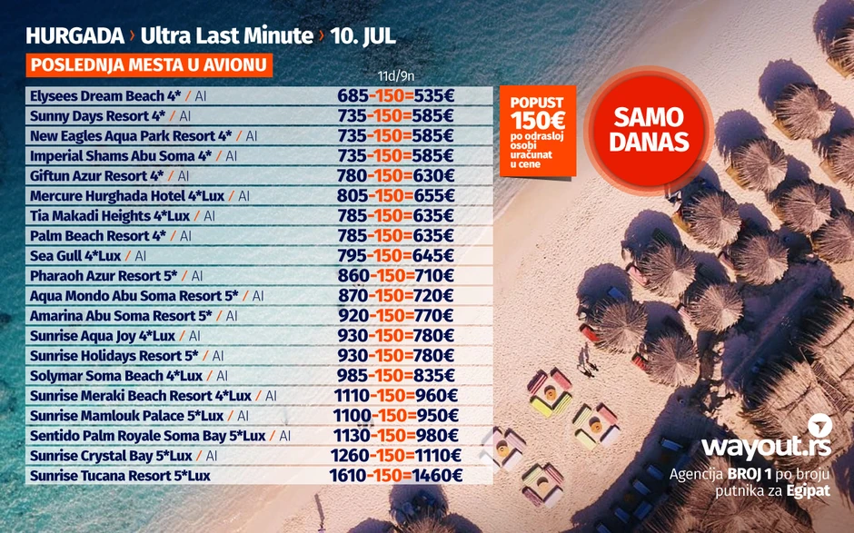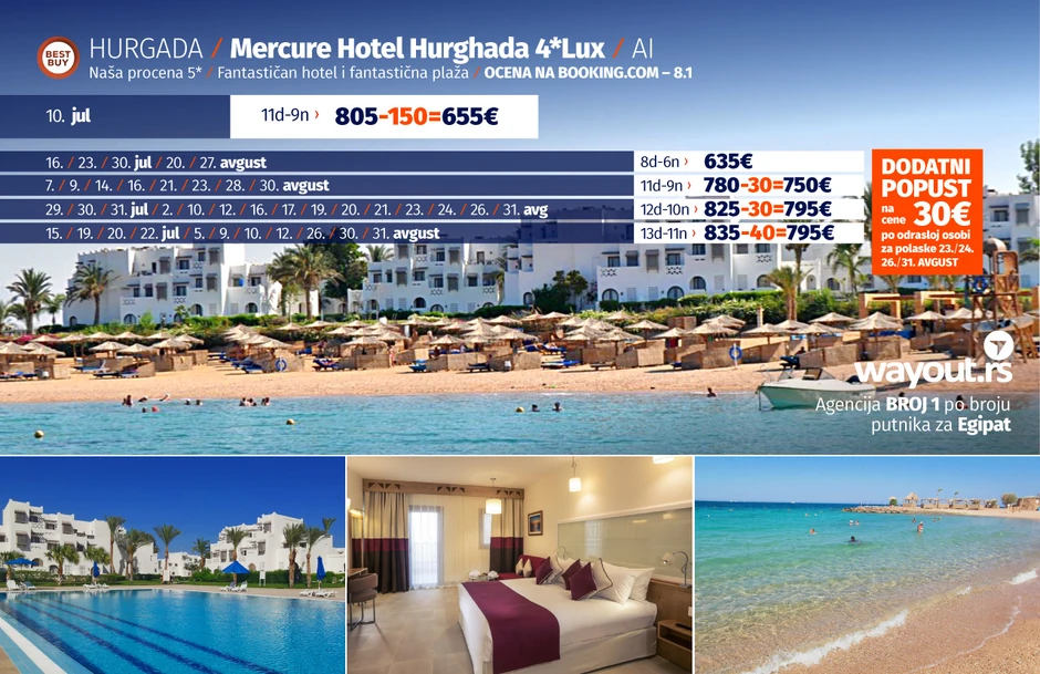 Kada je problem testova i uslova za ulazak u Egipat rešen, vreme je da bez stresa odaberete hotel po vašem ukusu i prepustite se planiranju svog dugo čekanog odmora. Za sve putnike koji žele da u julu provedu svoj odmor u Hurgadi, pripremili smo fantastičnu ULTRA Last Minute akciju za polazak 10. jul za poslednja mesta u avionu po do sada najpovoljnijim cenama, kao i Letnju rasprodaju za sve polaske u drugoj polovini jula i avgustu. Naravno, kao što ste navikli od Wayout agencije, u ponudi se nalazi najveći izbor hotela za svačiji ukus i svačiji džep i uključuje veliki broj najpopularnijih i najkvalitetnijih hotela u Hurgadi. Naravno, sve to u kombinaciji sa najpovoljnijim cenama na tržištu, Wayout ponudu za Hurgadu čini najboljom na tržištu što potvrđuje zvanje turoperatora br. 1 po broju putnika za Hurgadu.