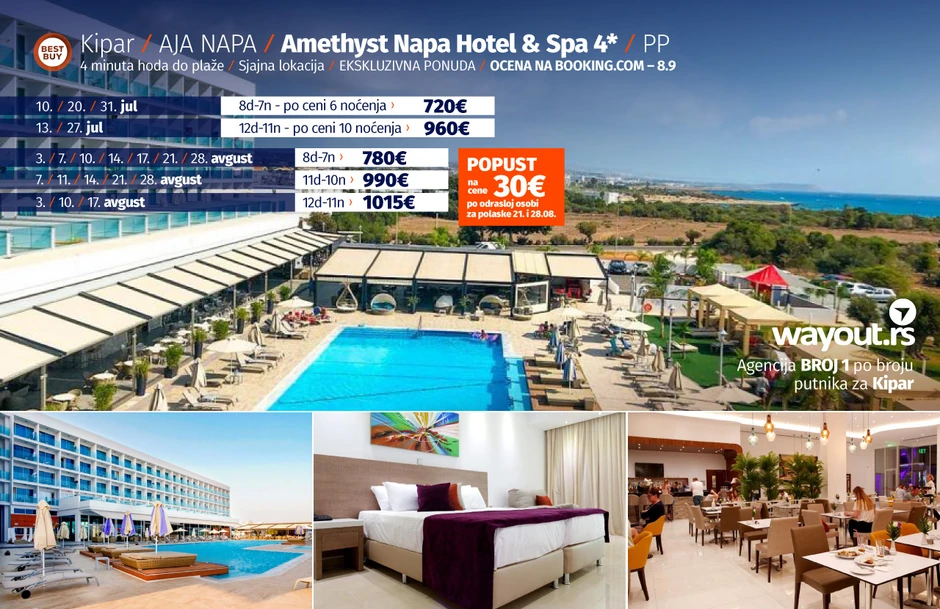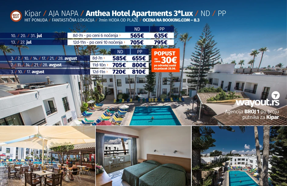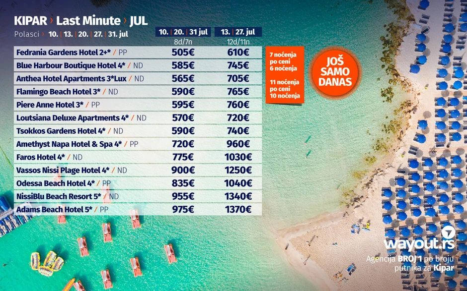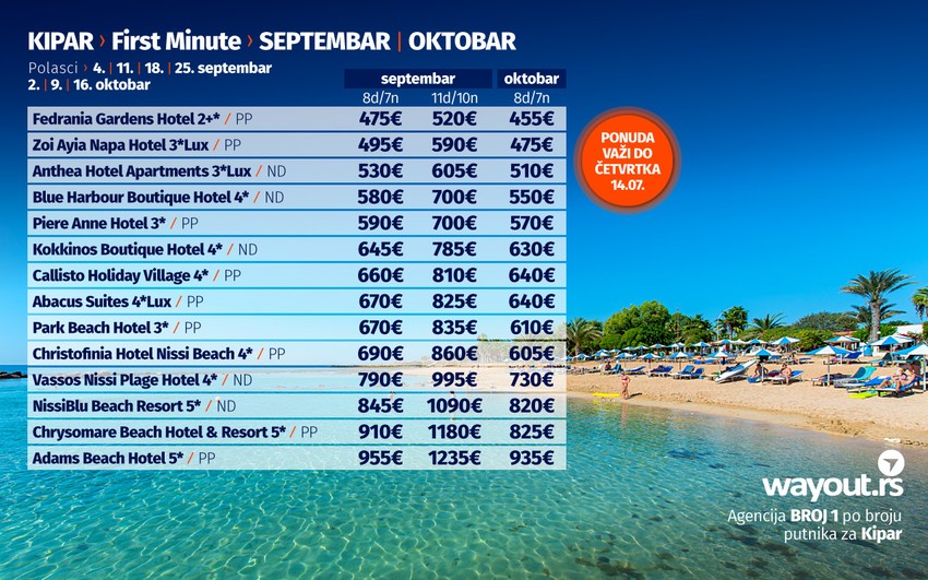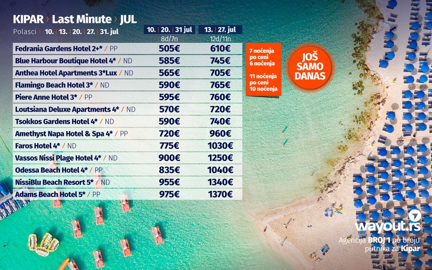 Definitivno jedna od novih omiljenih letnjih destinacija naših turista jeste Kipar. Sunčano i toplo vreme, prelepe plaže, fantastično more, odlična usluga i kvalitetni hoteli, u kombinaciji sa nikad povoljnijim aranžmanima za najtraženiji period putovanja u junu, julu i avgustu, navelo je putnike da se odluče za putovanje na ovo prelepo ostrvo. A ako ste navikli da svoje putovanje na Kipar koristite turističke online portale, nemojte da vam bude teško da proverite Wayout cene aranžmana, uverićete se da ne postoji povoljnija, a kvalitetnija ponuda na tržištu, a ukoliko nađete jeftiniji aranžman nego u našoj agenciji, vratićemo razliku.