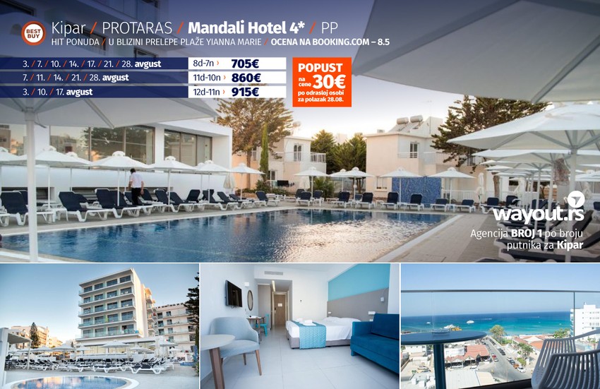 Ovaj objekat je udaljen 4 min hoda od peskovite plaže u Protarasu. Takođe, hotel poseduje i spoljašnji i unutrašnji bazen sa ležaljkama. Svaka soba u Mandali hotelu sadrži: ketler, mini frižider, tv i privatni balkon. U kupatilima se nalazi fen. U hotelu je dostupan restoran sa lokalnim specijalitetima. Pored bazena se nalazi bar. Na ulazu u hotel se nalazi supermarket gde možete pronaći sve namirnice za pripremanje hrane. Popularna plaža Fig Tree se nalazi na 1km od hotela, grad Agia Napa je udaljen 12km dok je aerodrom u Larnaki udaljen 45km. Hotel pruža besplatno parking mesto.