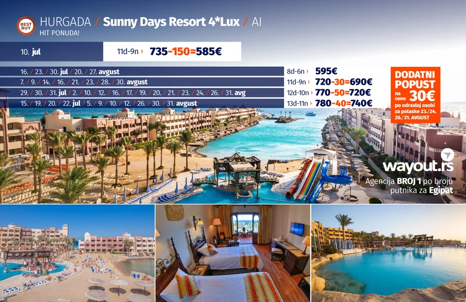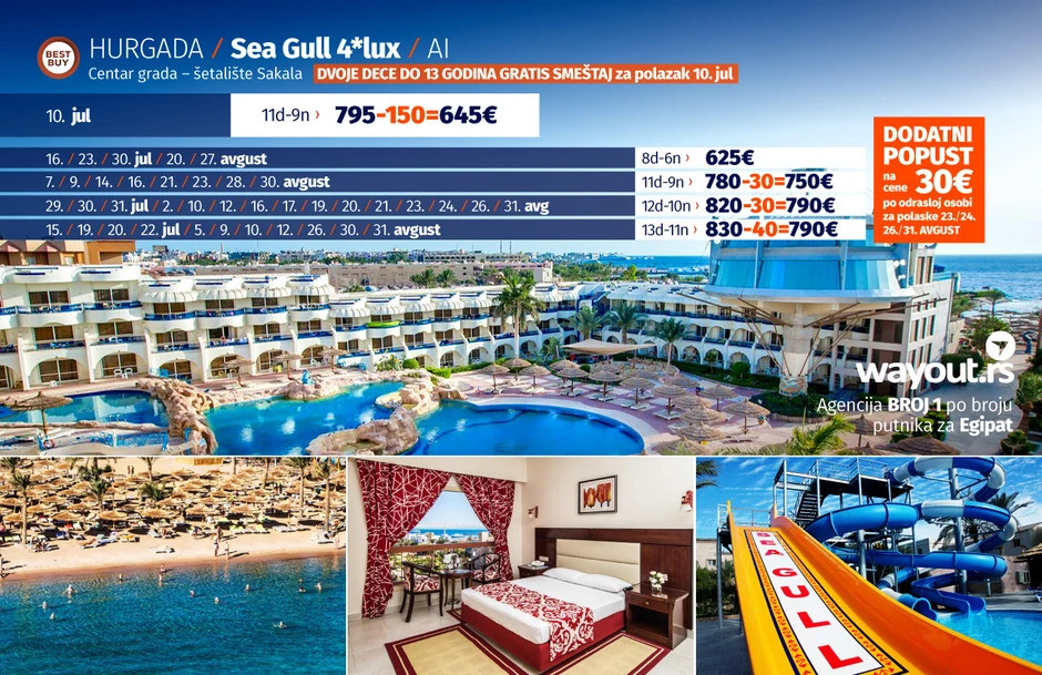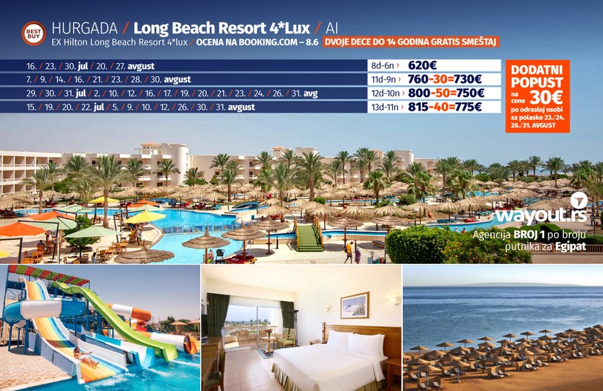 Naravno, period u julu i avgustu je najfrekventniji kada su u pitanju godišnji odmori, a za sve naše putnike, u saradnji sa najpopularnijim hotelima na našem tržištu, a definitivno je Hurgada porodično letovalište i kada se ceo trošak sabere, uzimajući u obzir nadaleko poznati All Inclusive koncept, ova destinacija je najisplativija, a Wayout agencija je ekskluzivno za svoje putnike obezbedila gratis smeštaj za dvoje dece do 14 godina u hotelima New Eagles Aqua Park, Long Beach Resort, Bella Vista, La Rosa Waves i Tia Makadi Heights.