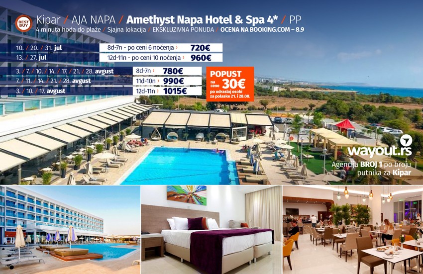 Amethyst Napa Hotel & Spa ima sve što je potrebno za zabavu i relaksaciju, a udaljen je svega 10 minuta hoda od prelepe plaže Landa Beach. Ovaj hotel ima otvoreni i zatvoreni bazen, hidromasažnu kadu i Splash Zone za decu. Za gastronomski užitak, tu su restoran na bazi švedskog stola, kafić i bar. Gosti se mogu opustiti u salonu ili dnevnom spa centru, a dostupne sobe su veoma moderne i dobro opremljene.