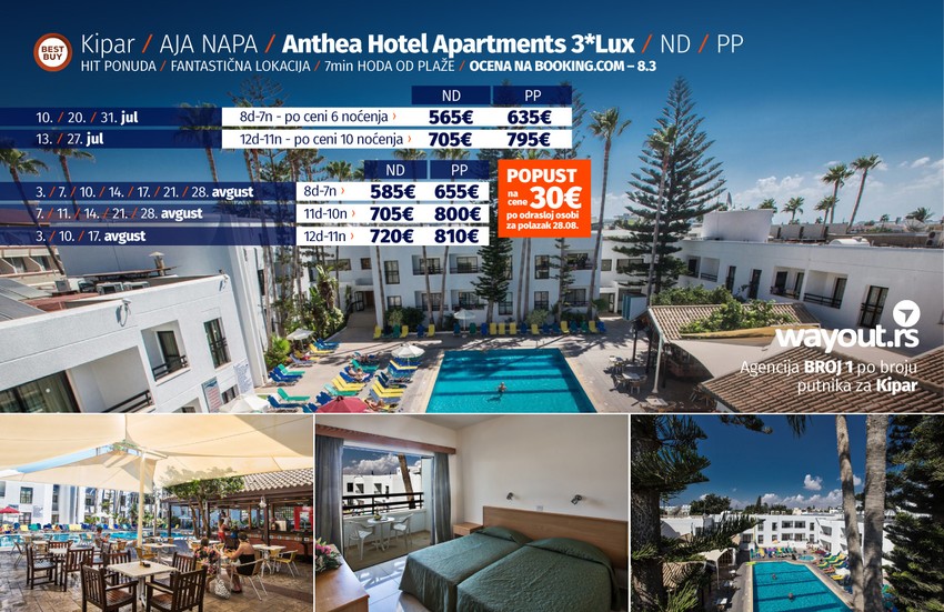 Ovaj objekat je udaljen 7 min hoda od plaže. Objekat Anthea Hotel Apartments se nalazi u Aja Napi, nedaleko od manastira Aja Napa. Iz smeštaja se pruža pogled na bazen, a u okviru objekta na raspolaganju je bazen na otvorenom. Klimatizovane smeštajne jedinice sadrže potpuno opremljenu čajnu kuhinju sa trpezarijom i tosterom. Takođe imaju frižider i kuvalo. Kontinentalni doručak i doručak na bazi švedskog stola služe se svakog jutra u ovom apart-hotelu. U restoranu u okviru objekta pripremaju se raznovrsna jela lokalne i internacionalne kuhinje. U okviru objekta Anthea Hotel Apartments na raspolaganju je terasa. Smeštajni objekat nudi i usluge iznajmljivanja bicikala i automobila. Akva-park WaterWorld Ayia Napa je udaljen 5 km od smeštaja.