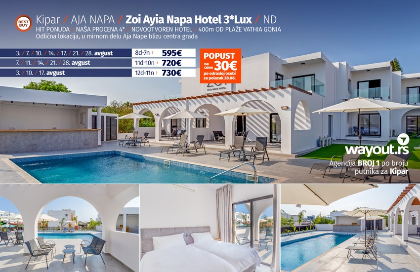 Ne propustite Letnju Šok akciju za jul i avgust, kao i za septembar i oktobar, koja se sastoji se od mešavine najtraženijih, najkvalitetnijih i najbolje ocenjenih hotela na Kipru, a sve to uz spektakularno povoljne cene, slobodno možemo reći i najpovoljnije do sad. Od hotela za ovaj period bismo izdvojili hotele u Aja Napi koji se nalaze na odličnim lokacijama blizu plaža i samog šetališta, a to su Pierre Anne Hotel i Tasia Maris Beach koji se nalazi uz obalu, i Fedrania Gardens, a svega nekoliko minuta hoda od samog centra Aja Nape, kao i Abacus Suites, luksuzni boutique hotel takođe nedaleko od plaže i centra svih zbivanja u Aja Napi. Svakako, ne smemo zaboraviti porodični hotel Callisto Holiday Village sa promocijom koja podrazumeva da dvoje dece do 14 godina ne plaćaju smeštaj kao i jedan od najluksuznijih hotela u Aja Napi Adams Beach, koji u Superior sobi može smestiti dvoje dece do 13 godina koja plaćaju samo avio kartu, kao i hotel Christofinia Hotel koji se nalazi svega 200 metara udaljen od Nissi plaže.