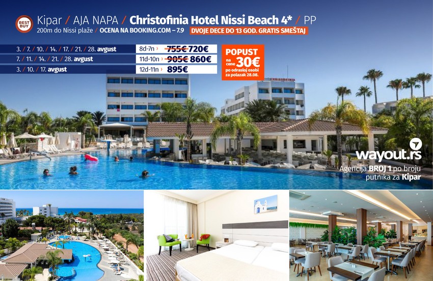 Hotel Christofinia se nalazi u najpopularnijem, kosmopolitskom letovalištu Aja Napa i na svega nekoliko minuta hoda od čuvene plaže Nissi Beach. Hotel je veoma miran i okružen je prelepim, prostranim vrtovima i vrhunskim bazenom. Porodice i parovi mogu da se rashlade u ogromnom bazenu u obliku lagune, u kom se nalazi odlično opremljeni bar. Gostima hotela na raspolaganju je i dečiji bazen. Plaža Nissi Beach je jedna od najpoznatijih plaža na Kipru koja je nagrađena Plavom zastavom i nalazi se odmah iza ugla. Udaljen je 3 kilometra od užurbanog centra letovališta i na 200 metara od ulice pune barova, restorana i prodavnica. Sve navedeno se nalazi na pešačkoj udaljenosti od hotela. Christofinia je idealan izbor za savršen i nezaboravan odmor u tihom i mirnom kraju Aja Nape.