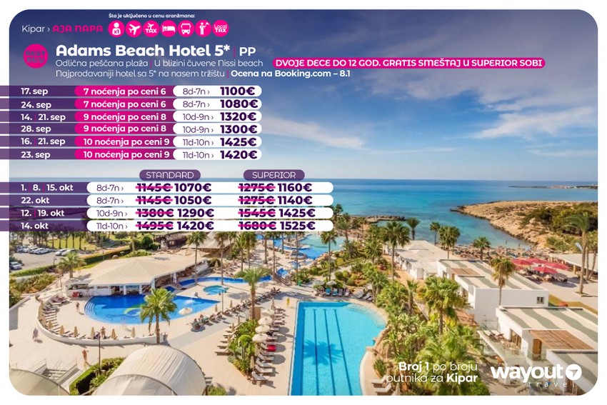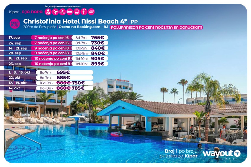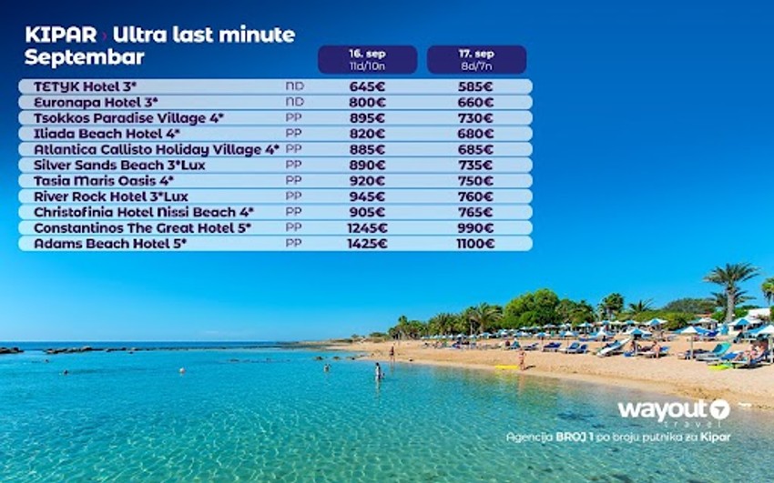 Definitivno nova omiljena letnja destinacija naših turista, svakako jeste rajsko ostrvo Kipar. Osetite čari Mediterana, fantastičnih plaža, veoma kvalitetnih hotela, izuzetne gastronomske ponude, kao i nezaboravnog noćnog provoda. Za naše putnike smo spremili odličnu first minute ponudu sa pažljivo izabranim hotelima, kako na osnovu pređašnjih iskustava naših klijenata, tako i na osnovu odličnih ocena na turističkim portalima.