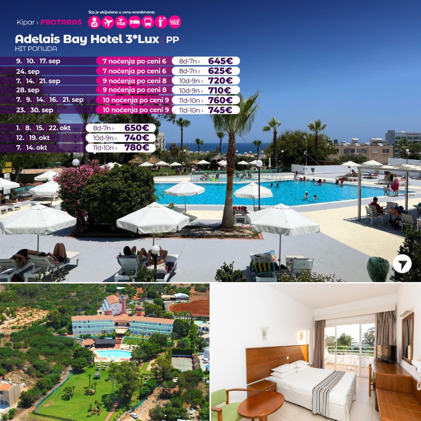 Hotel Adelais Bay udaljen je 500m od plaže Green bay, plaža koja se nalazi između čuvene Fig Tree plaže i Konnos plaže. Hotelski prostor pokriva velika bašta sa otvorenim bazenom. Sobe su klimatizovane sa SAT TV i balkonom ili terasom. Svaka soba poseduje sopstveno kupatilo sa fenom za kosu. U sastavu hotela je Aurora restoran i bar Ilios pored bazena. Opremljen je sa igralištem na otvorenom sa stolicama za ljuljanje i igraonicom, dok se uz doplatu može obezbediti usluga čuvanja dece. Grad Protaras udaljen je od hotela 15 minuta hoda.