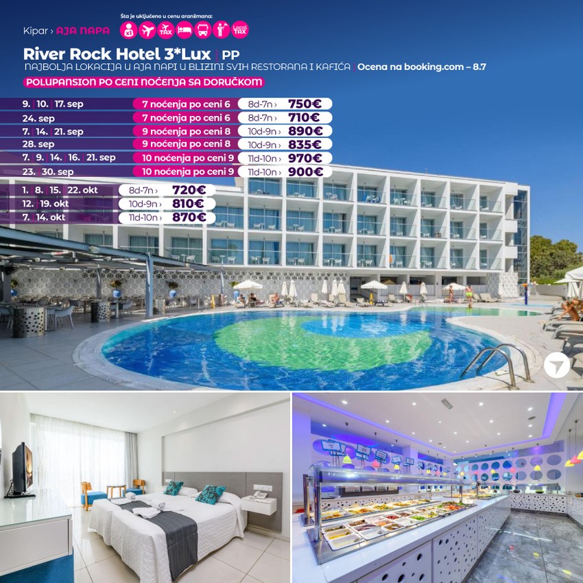 Hotel River Rock nalazi se u mestu Aja Napa i poseduje otvoreni bazen i terasu za sunčanje. Na raspolaganju je dečije igralište, a besplatan bežični internet je dostupan u celom objektu. Sve sobe nude balkon sa pogledom na grad. Pored toga sadrže flat-screen TV i klima-uređaj. Gostima je na raspolaganju sopstveno kupatilo sa tušem i fenom za kosu. Dodatne pogodnosti uključuju sef, frižider i posteljinu. Ponuda hotela River Rock uključuje recepciju koja radi non-stop, vrt i bar.