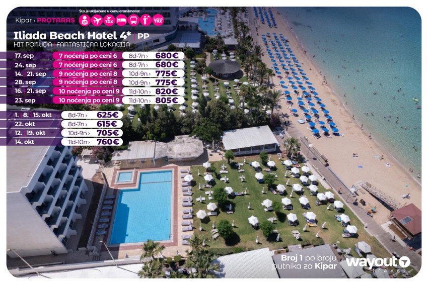 Hotel Iliada Beach je smešten odmah pored peščane plaže u centru Protarasa i nudi bazen sa terasom koja gleda na more. Na raspolaganju su vam takođe dečji bazen, dva restorana, tri bara i snek bar. Sve sobe u hotelu Iliada Beach imaju namešten balkon, TV sa satelitskim kanalima, mini-frižider, aparat za pripremu čaja/kafe i sef.Na plaži ispred samog hotela možete uživati u velikom izboru sadržaja za sportove na vodi, dok se restorani, prodavnice i barovi nalaze na nekoliko minuta hoda. Najbliži aerodrom je Aerodrom Larnaka, udaljen 42 km od hotela Iliada Beach.