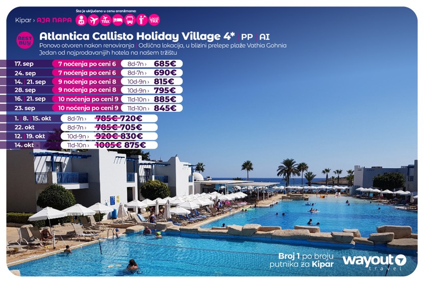 Callisto je kompleks osmišljen kao kopija tradicionalnog mediteranskog sela sa belim dvospratnim vilama plavih šalona, prozora i vrata. Vile su okružene egzotičnim drvećem i cvećem, povezane uzanim stazama sa centralnim delom hotela, u kome se nalazi restoran, recepcija, bazeni i prolaz do prelepe peščane plaže. Idealan izbor za porodice sa decom i sve ostale koji uživaju u raskošnoj prirodi, a na nekoliko minuta hoda od glavne ulice poznatog letovališta Aja Napa. Centar grada udaljen je 1,5km. Besplatan ulaz u akva park nedaleko od hotela!