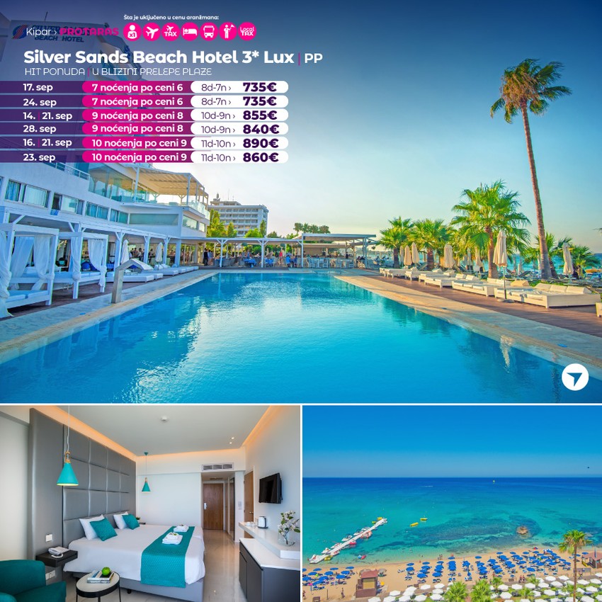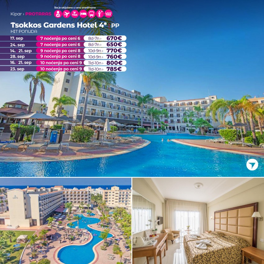 Otmen i elegantan hotel, smešten je na jednoj od najlepših peščanih plaža u regiji, u samom centru Protarasa, 47km od aerodroma u Larnaki. Sve sobe, prostor oko bazena i restoran, renovirani su u potpunosti pred sezonu 2018. god. Od sadržaja hotel ima veliki spoljašnji bazen sa delom za decu, zatvoreni bazen, glavni restoran, a la carte restoran, bar u lobiju, koktel barove na plaži i pored bazena, prodavnicu suvenira, salon lepote, frizera, stoni tenis, animaciju, saunu, teretanu, parno kupatilo i teniski teren. Sobe su prostrane, sa balkonom, imaju SAT TV, telefon, fen, sef, mini frižider, ketler, wi-fi internet. U sobama upotreba sefa, frižidera i interneta dodatno se naplaćuje.