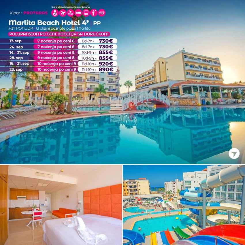 Hotel se nalazi na Marlita plaži, u regiji Pernera, na 15 minuta hoda od centra Protarasa. Marlita Beach Hotel Apartments nudi otvoren bazen, terasu za sunčanje sa poglednom na more i mediteranski restoran. Apartmani i studiji su moderno uređeni, sa čajnom kuhinjom i prostorom za sedenje. U sklopu smeštajnih jedinica nalazi se i kupatilo sa kadom, toaletnim priborom i fenom za kosu. SAT TV i sef su dostupni. Gosti mogu da koriste hotelski restoran i vodeni park koji se nalazi na nekoliko minuta hoda od hotela. Za decu su tu igralište, dečiji bazen i oprema za igru na otvorenom. Od plaže Trinity smeštaj je udaljen oko 2.5km, dok je od aerodroma Larnaka udaljen 47km.