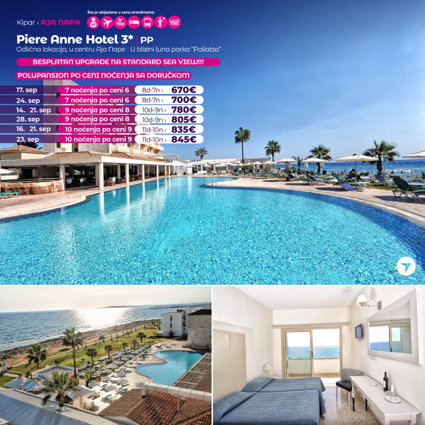 Hotel Piere Anne ima odličnu lokaciju na obali mora, na 5 minuta od centra Aja Nape i na 5 minuta od luke i plaže. Zabavni park Parko Paliatso Fun se takođe nalazi odmah iza hotela, zajedno sa čuvenom ulicom Nissi Avenue. U neposrednoj blizini nalaze se prodavnice, barovi i restorani, a svi sadržaji Aja Nape su na dohvat ruke. Hotel Piere Anne se sastoji od 3 bloka soba sa 2 velika otvorena bazena.Bazeni imaju direktan pristup stazi uz more, a bar pored bazena "En Plo" je odlično mesto za opuštanje tokom dana. Iako hotel nema mnogo sadržaja na licu mesta, Piere Anne je toliko blizu svega u Aja Napi da je odlična baza za zabavu na plaži ili provod u klubovima, kao i odmor uz Mediteran.
